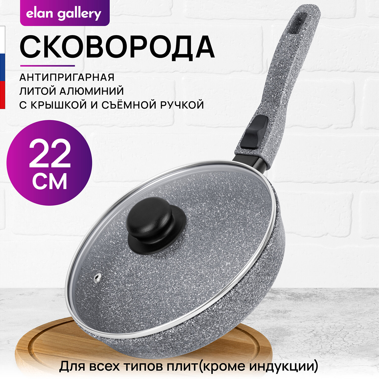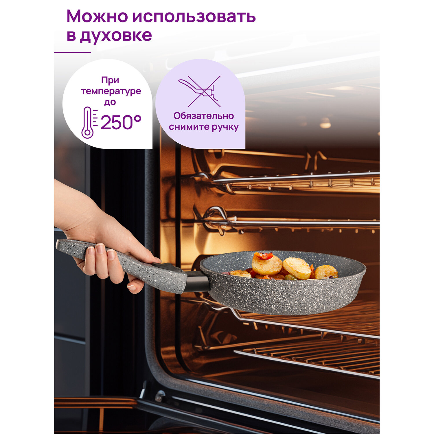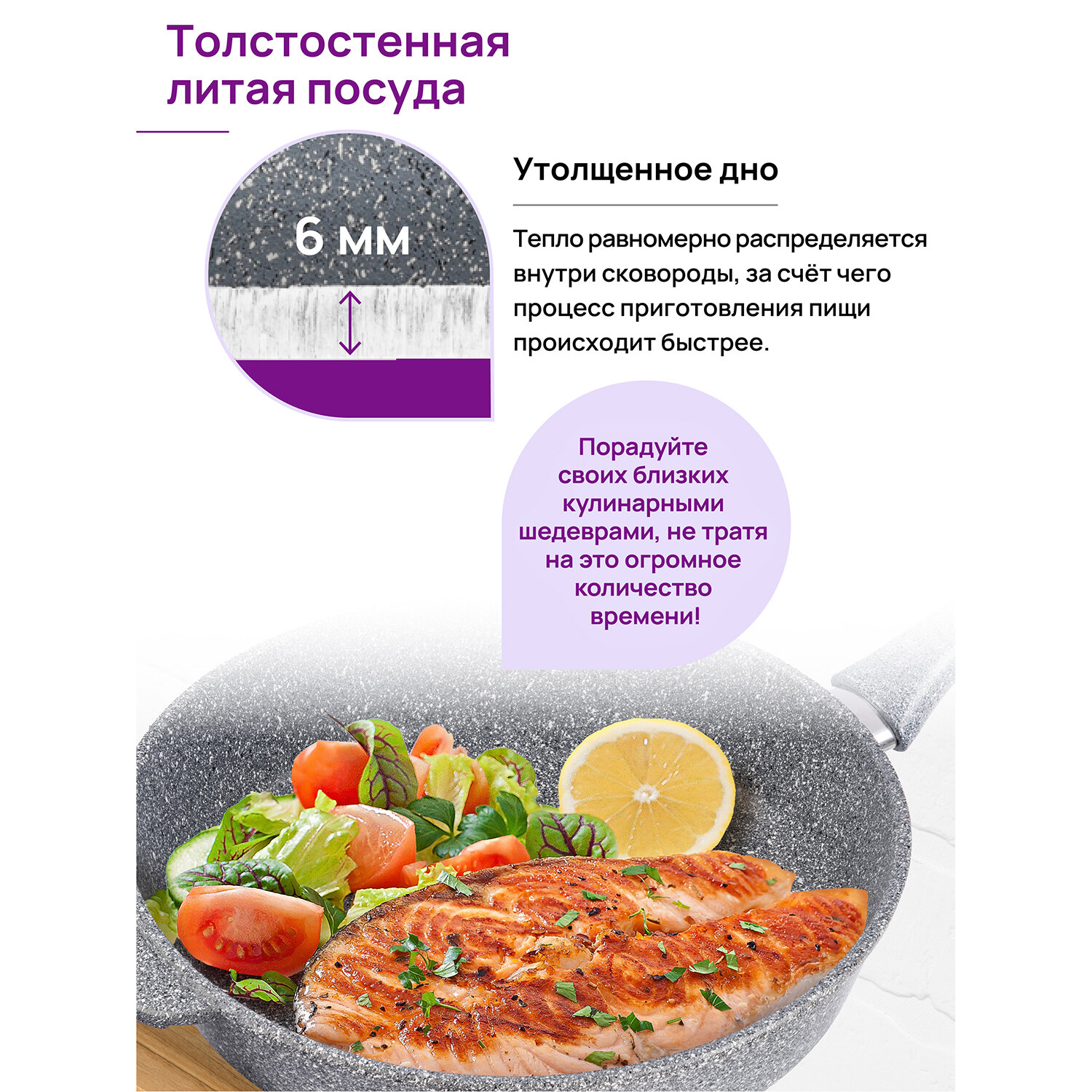 Сковорода глубокая 22 см Elan Gallery гармония вкуса Серый мрамор с крышкой D22, съёмная ручка интересное: