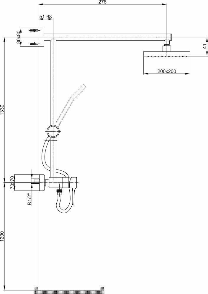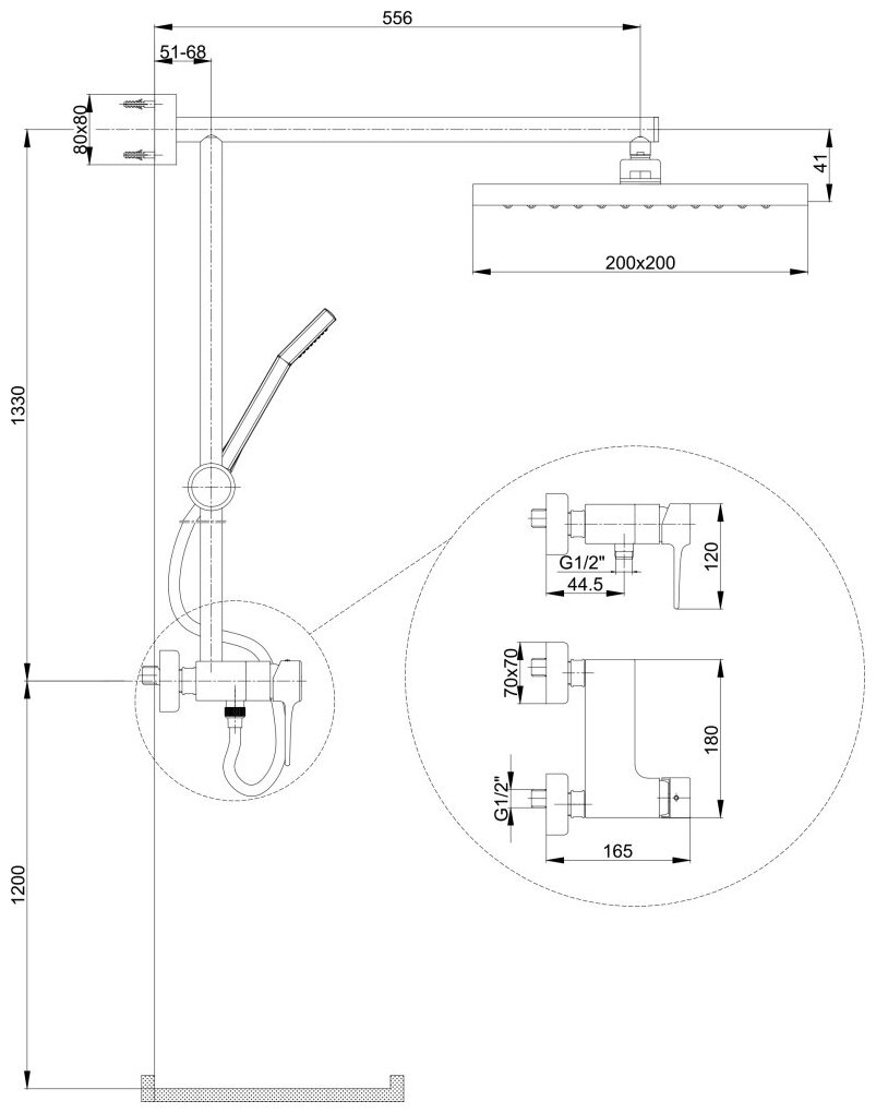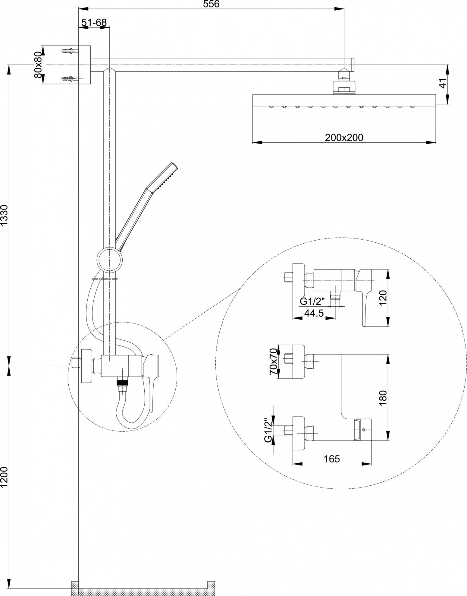 | Дополнительная информация | высота стойки для душа: 1330 мм; длина верхнего душа: 200 мм; ширина верхнего душа: 200 мм |