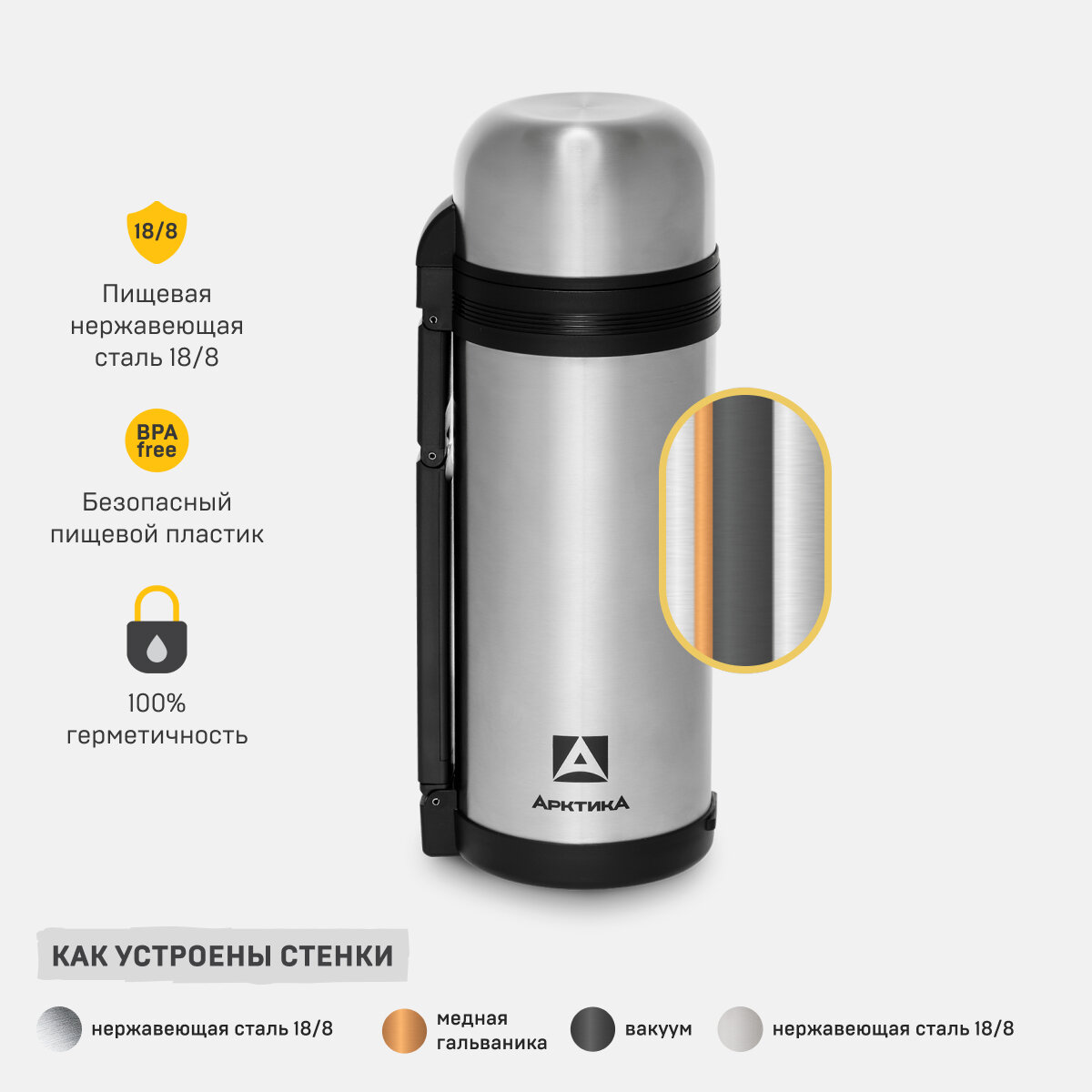 Термос с ручкой для чая и еды Арктика 201-1000 - Объем 1000 мл - Сталь