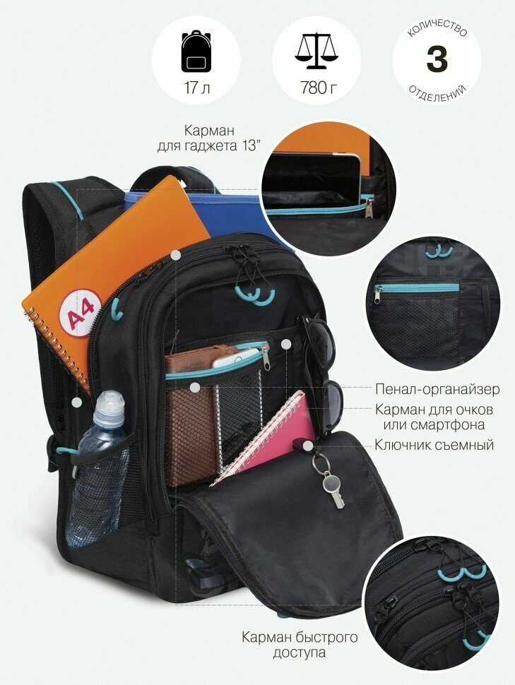 Купить Школьный рюкзак с ортопедической спинкой GRIZZLY RU-338-1 черный - бирюзовый, грудная стяжка, 3 отделения, 42x31x22см, 17л.