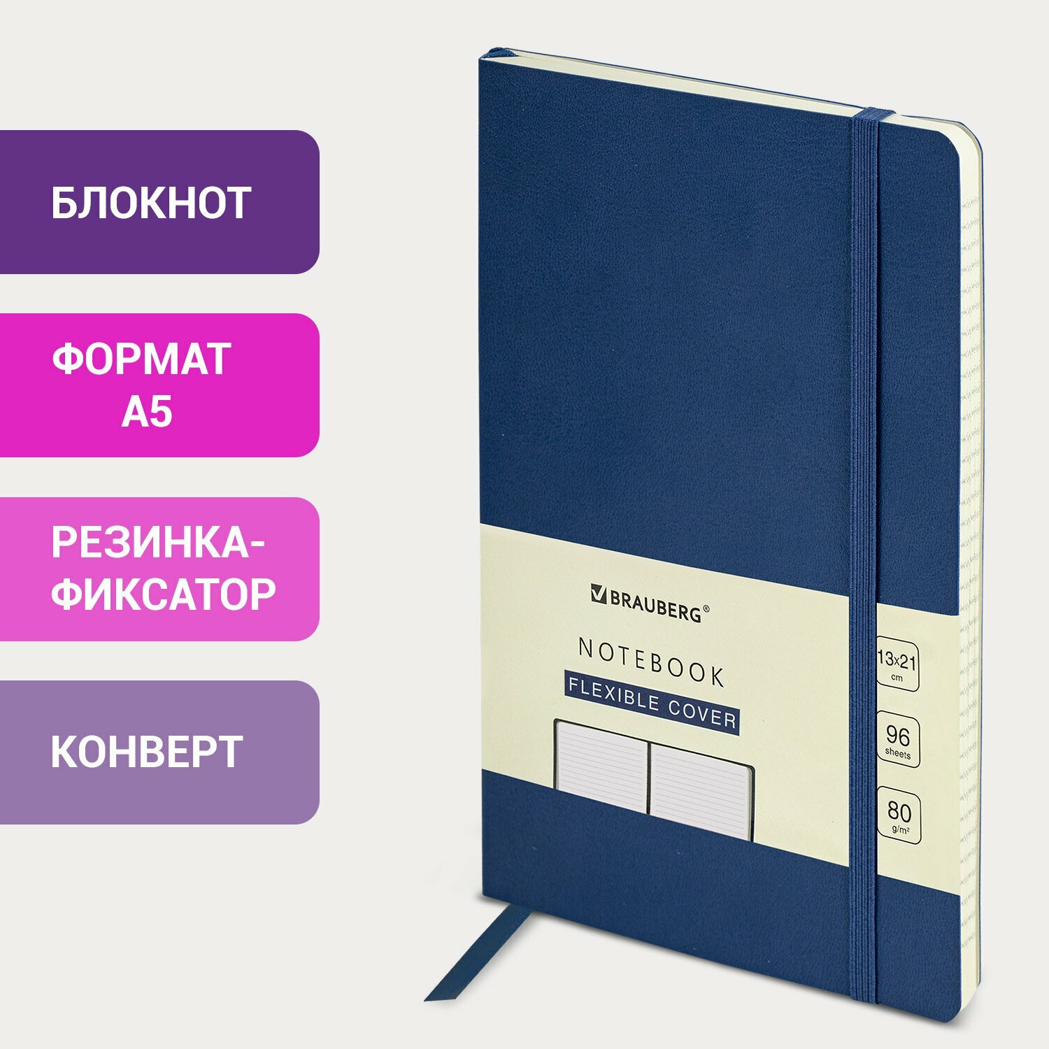 Бизнес-блокнот / записная книжка мужской / женский А5 (148х218 мм), Brauberg Note, под кожу софт-тач, с резинкой, 80 листов, клетка, синий