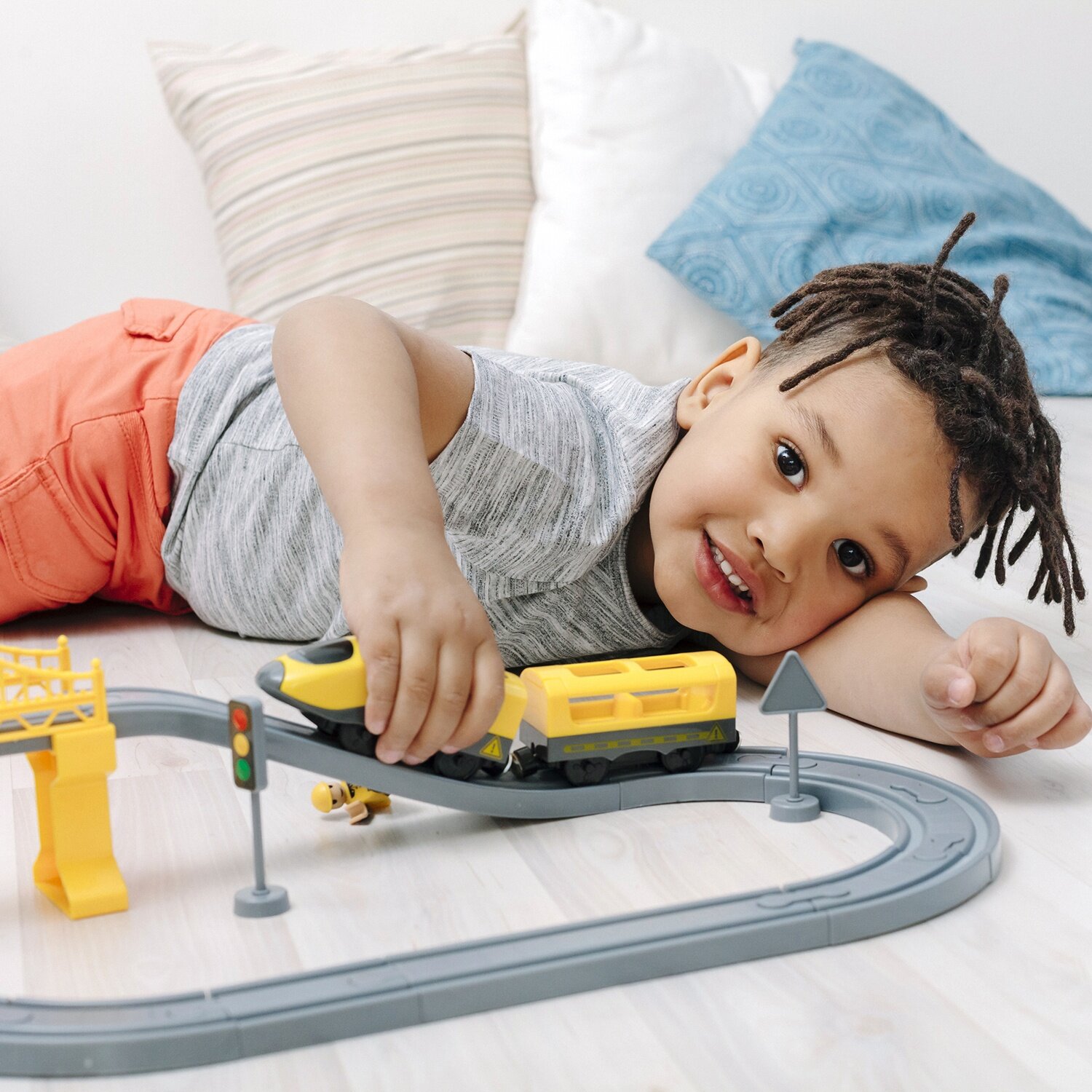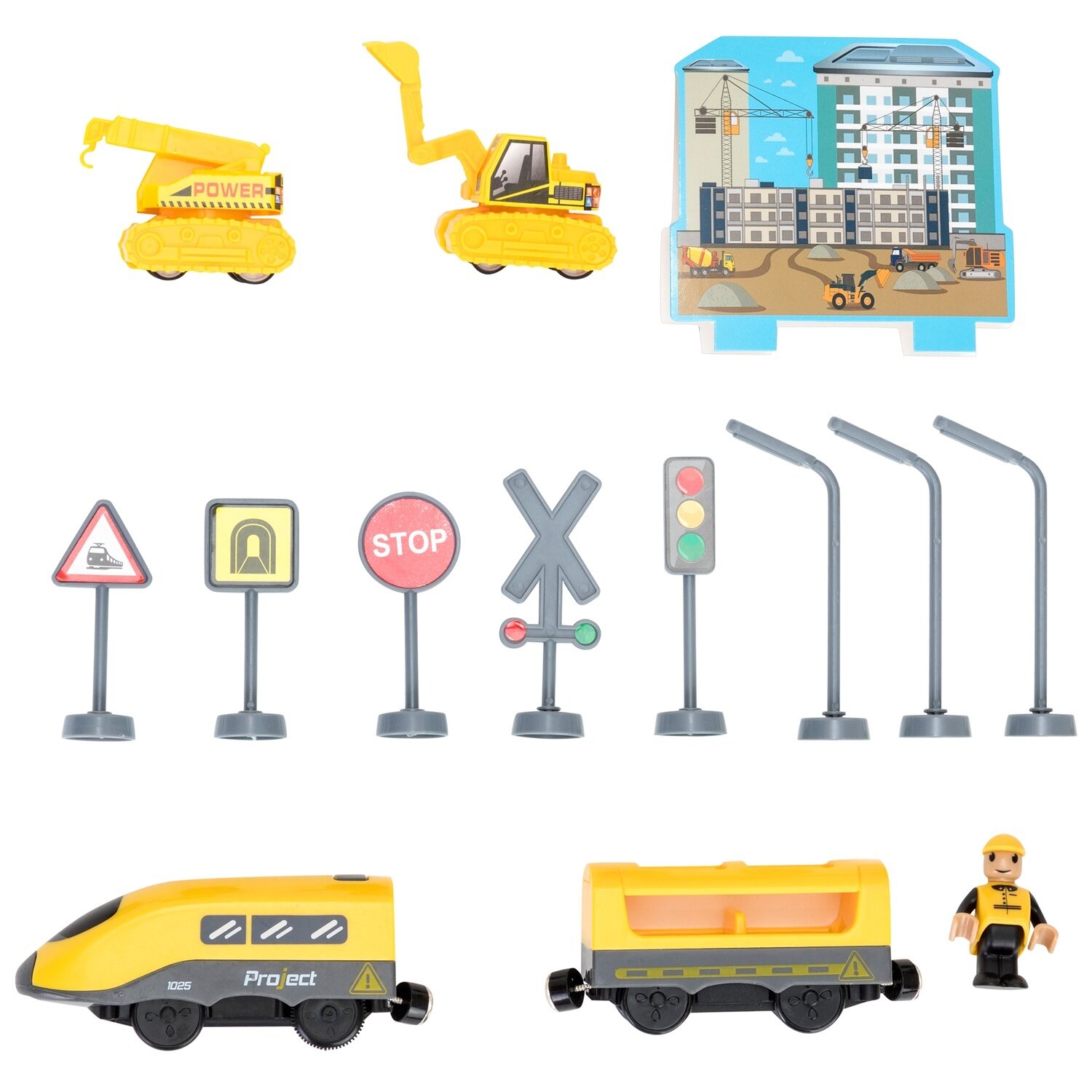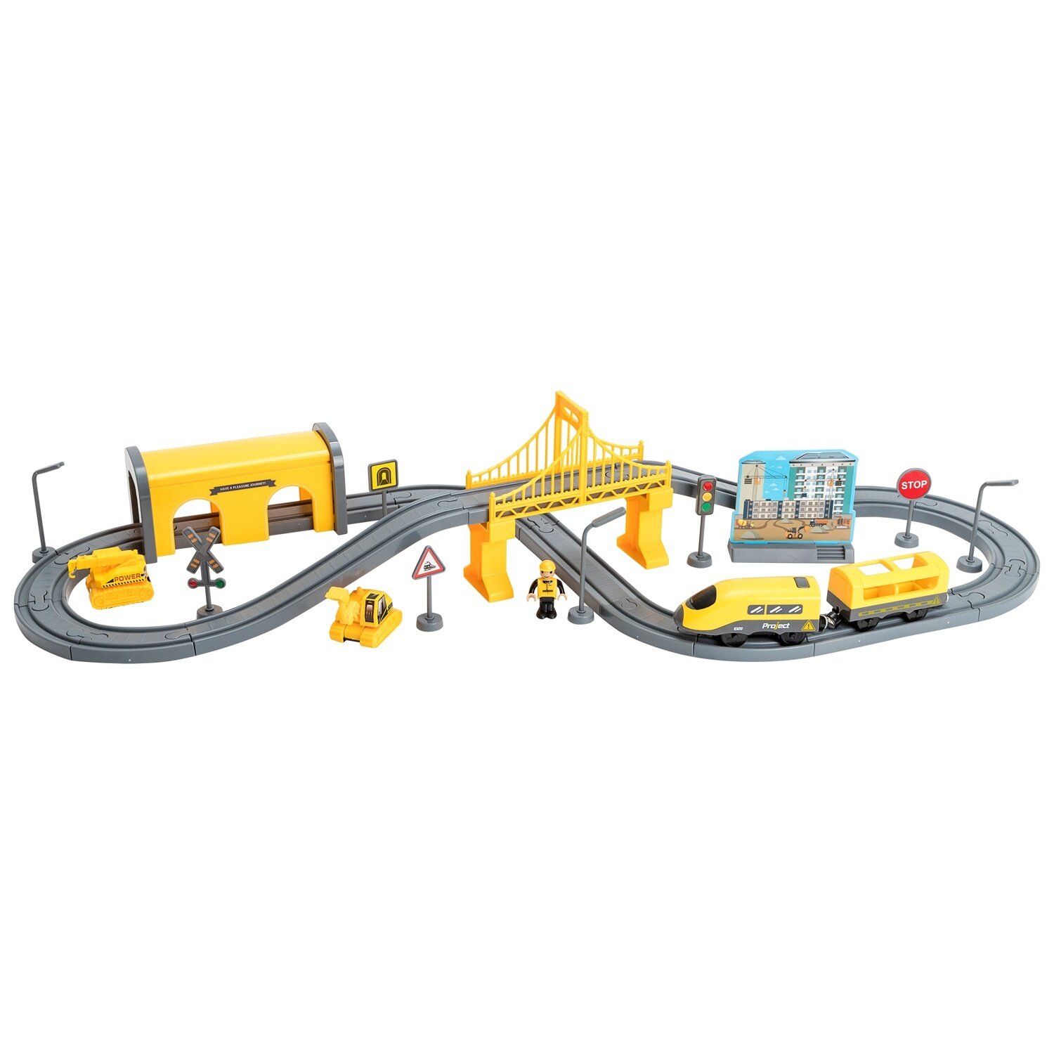| Подробная комплектация | локомотив, один вагон, железная дорога, мост, туннель, две машинки, фигурка строительного объекта, дорожные знаки (6 штук) и фигурка строителя. |