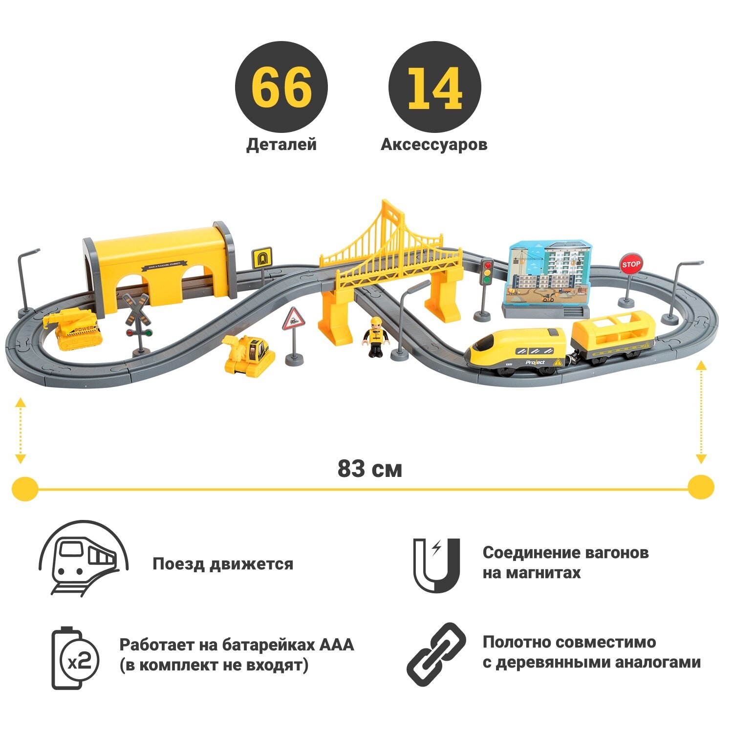 Железная дорога для детей "Строительная площадка, 66 предметов", на батарейках