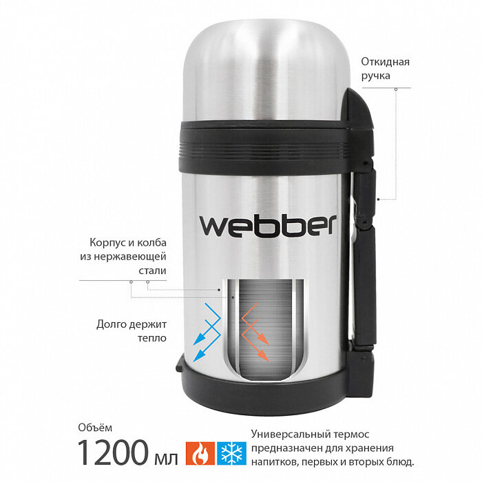 Термос Webber SST-1200P универсальный с ручкой на корпусе, 1.2л
