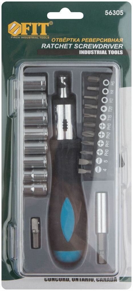 Отвертка FIT 56305 реверсивная, 22 CrV бит и головок, прорезиненная ручка, в чемоданчике