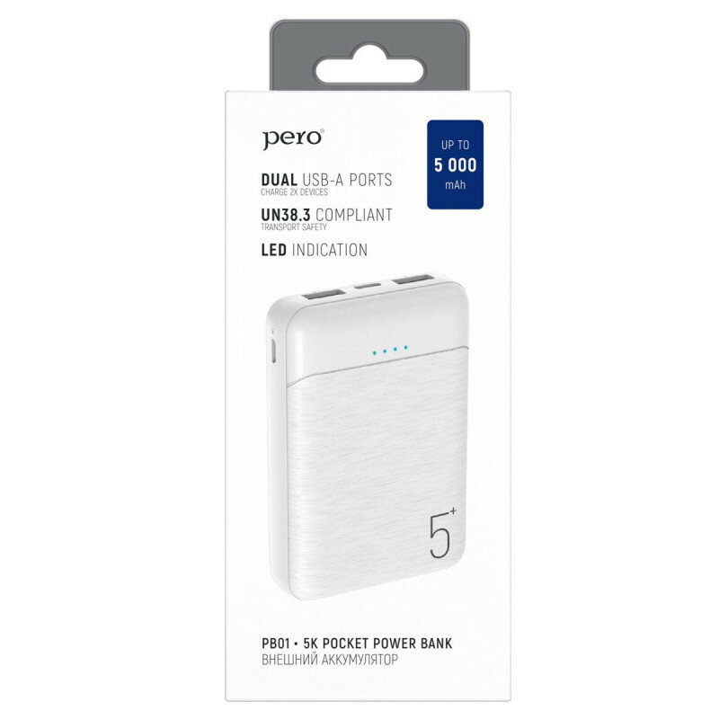 PERO Внешний аккумулятор PERO PB01, 5000 мАч, 2 USB, 2.1 А, индикатор, белый