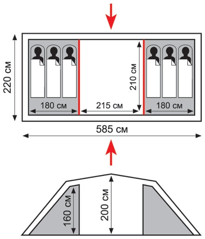 | Габариты внешней палатки(ДxШxВ) | 585x220x200 cм |