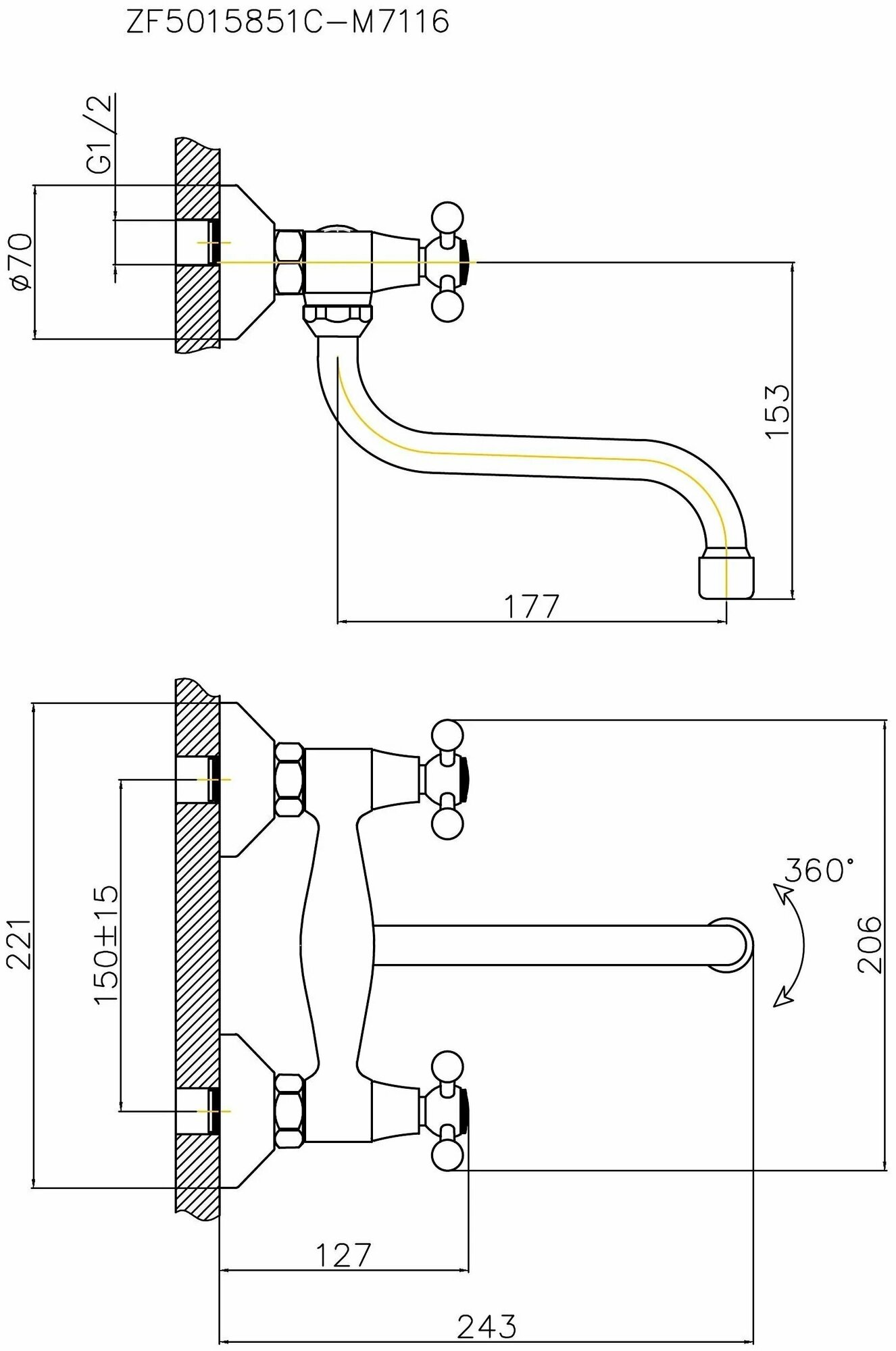 CRON Смеситель для кухни (Zn) настенный,трубчатый повор.излив 177мм,двухвентельный,гайка,хром,CN4608