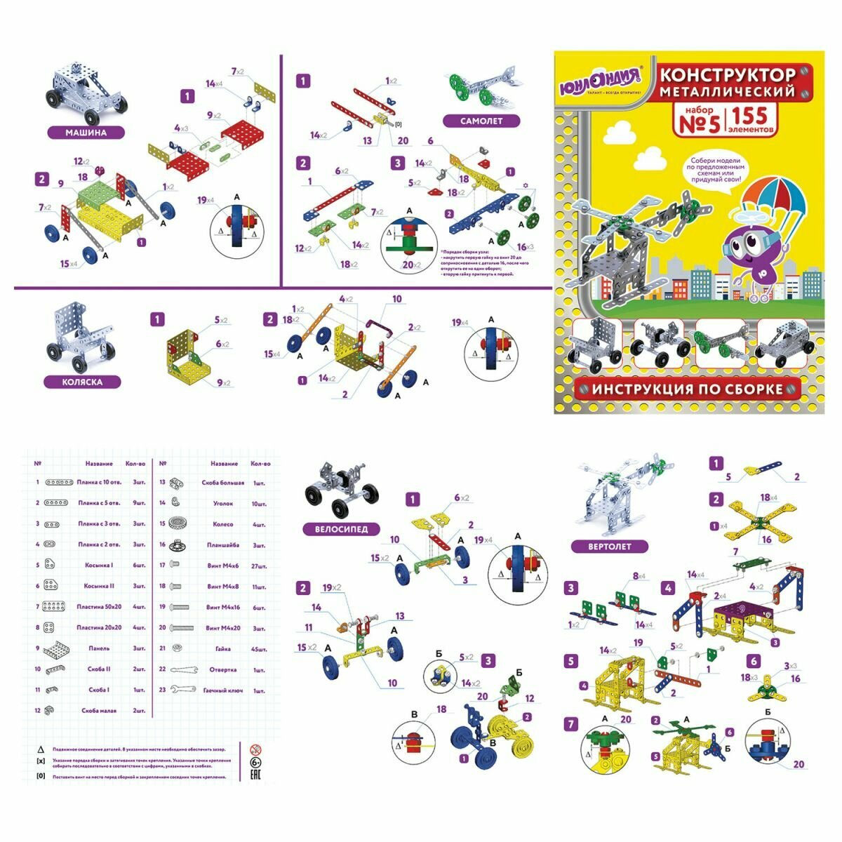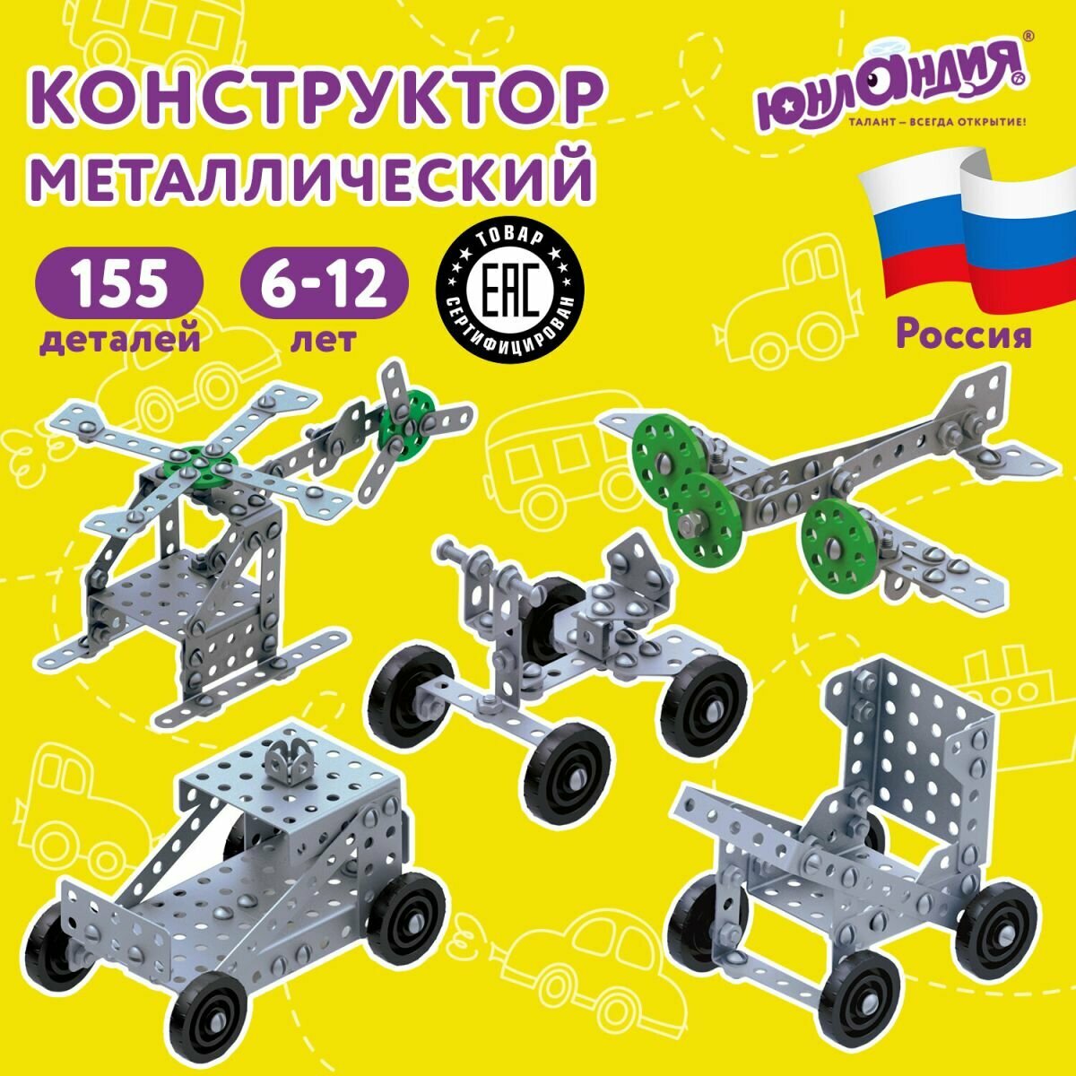 Комплект 6 шт, Конструктор металлический юнландия "Для уроков труда №5", развивающий, 155 элементов, 104683