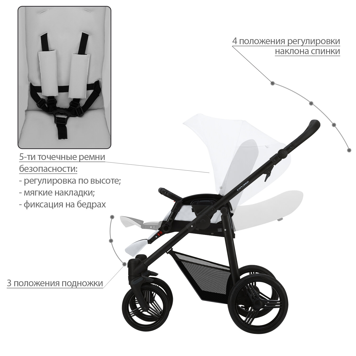 | Особенности | мягкие накладки на ремни, регулировка высоты подножки, регулировка наклона спинки, ремни безопасности, съемный бампер, смотровое окн |