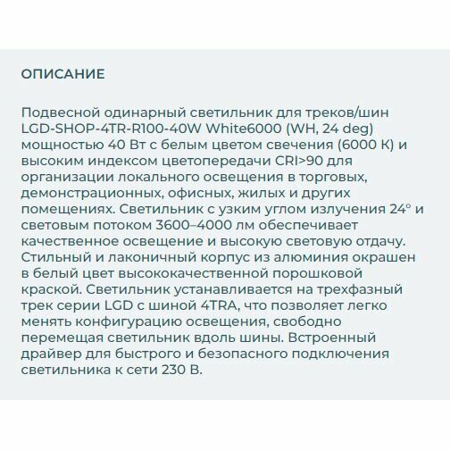 | Подробная комплектация | Люстры и потолочные светильники Arlight LGD-SHOP-4TR-R100-40W White6000 (WH, 24 deg) |