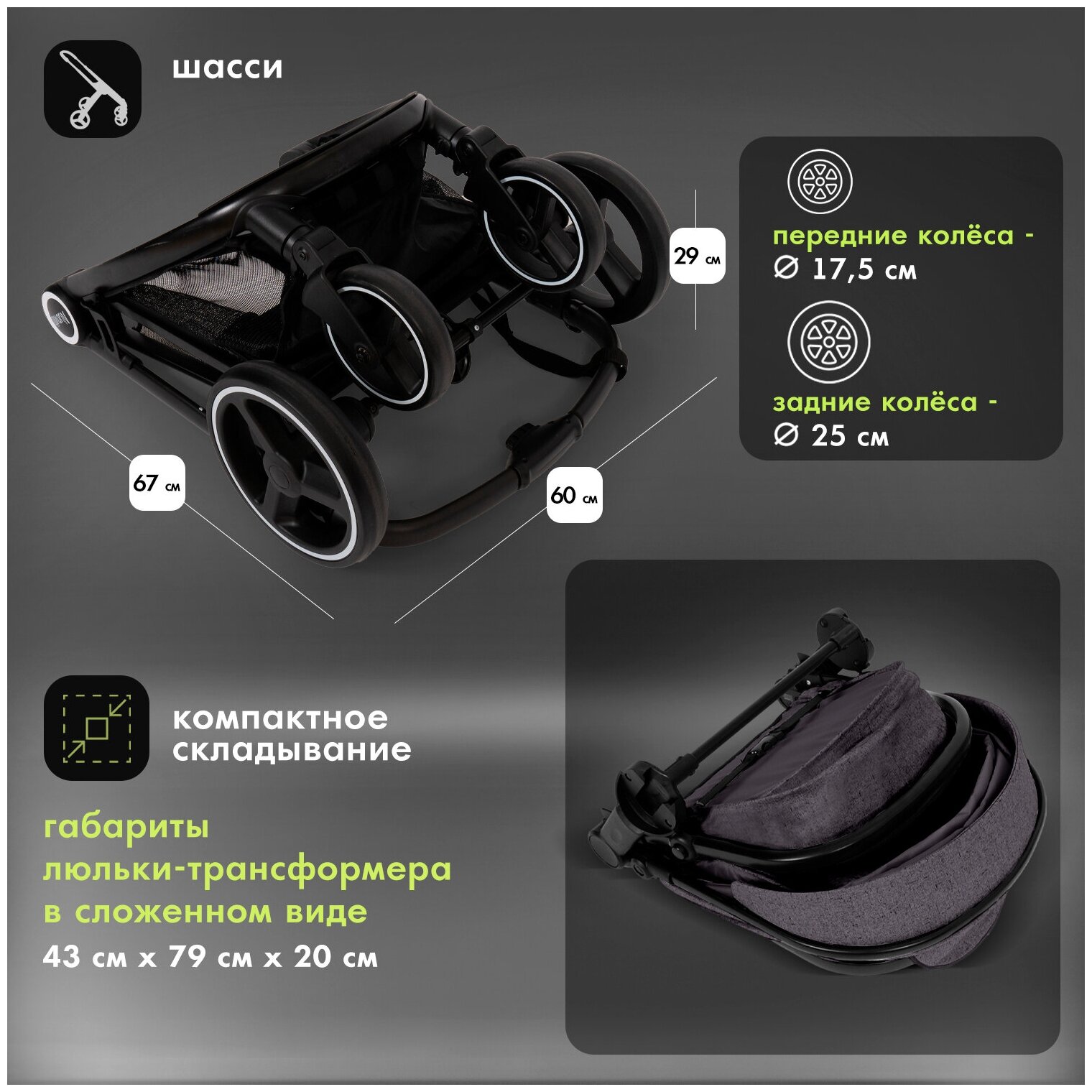 | Особенности шасси | корзина для покупок / перекидная ручка / регулировка высоты ручки / ручной тормоз |