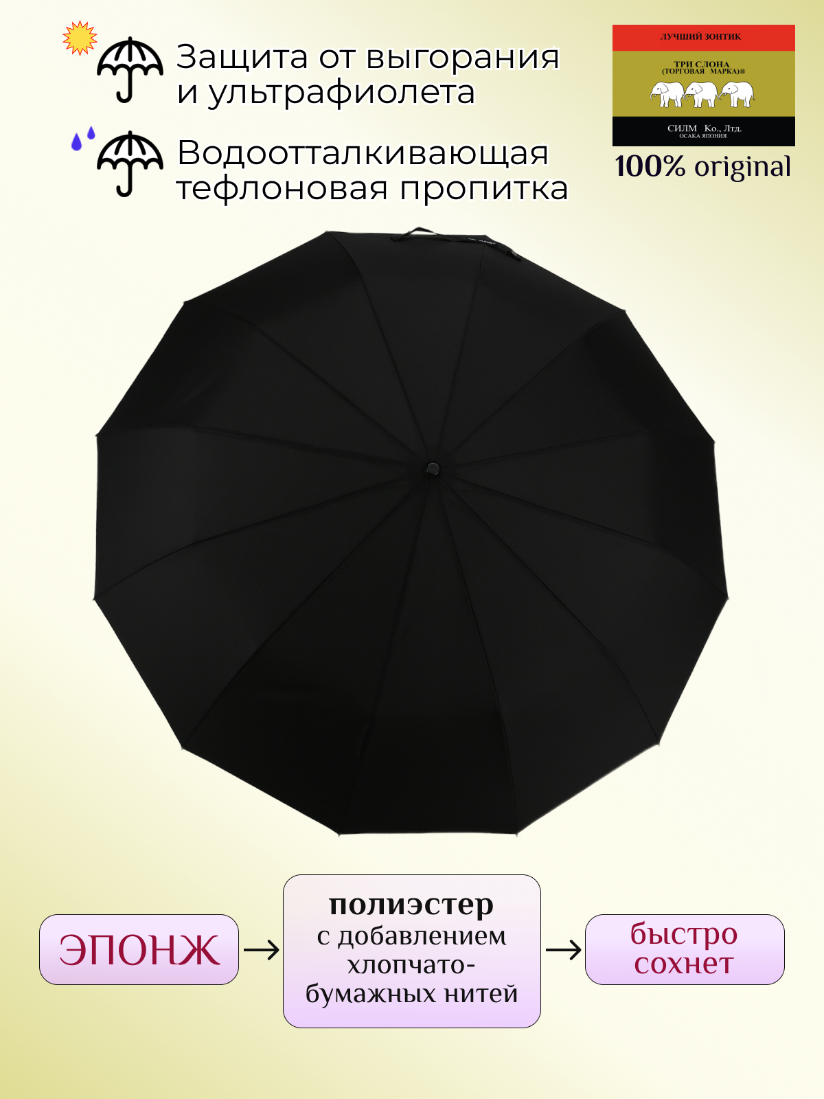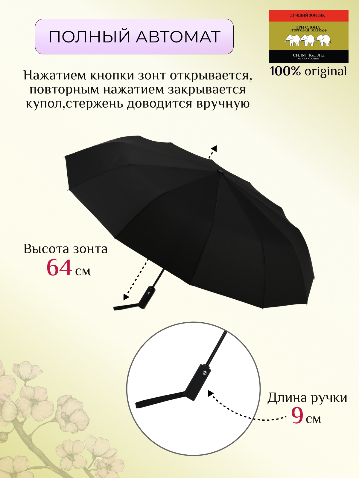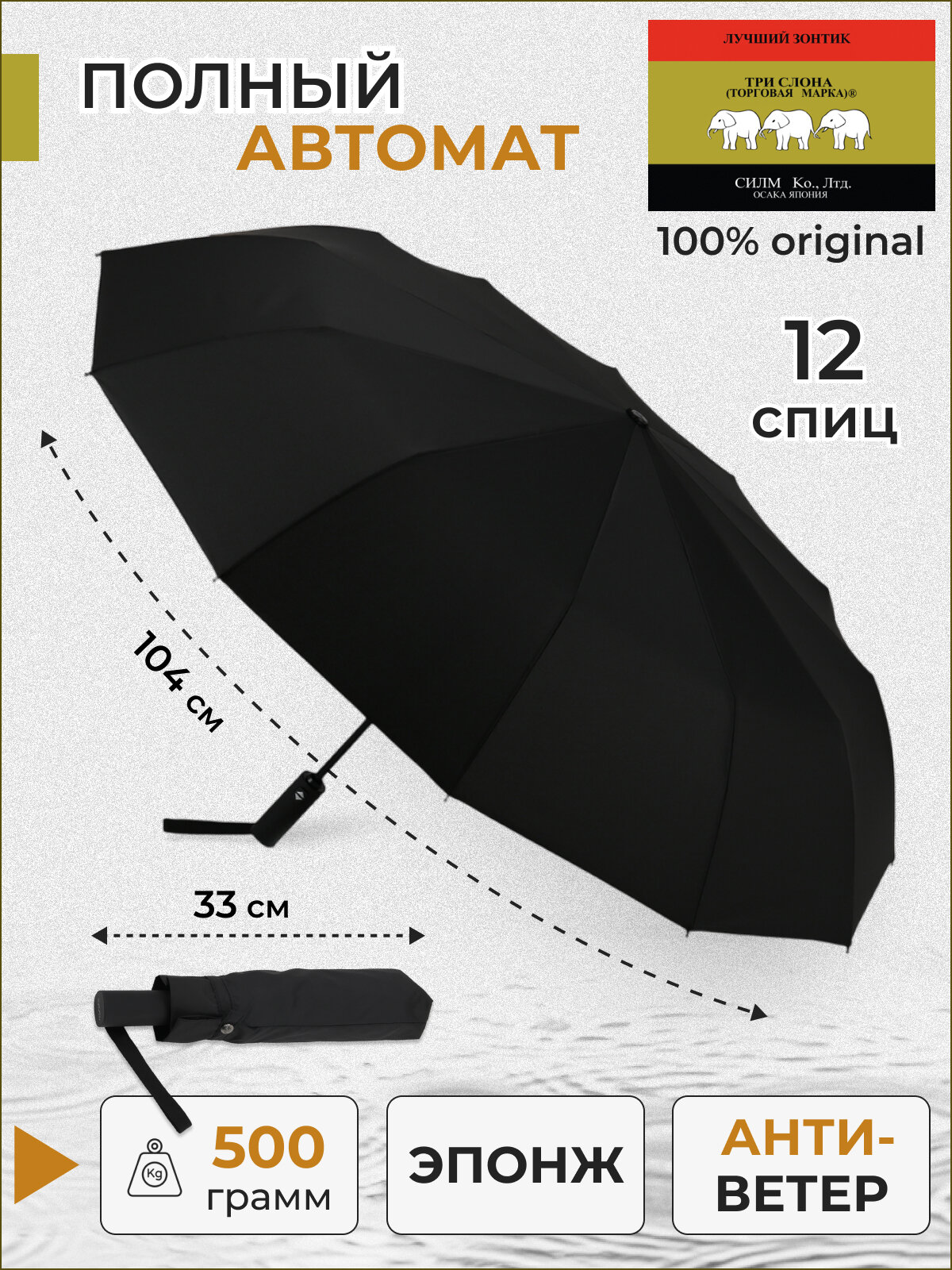Зонт мужской ТРИ слона , сложения, автомат, ручка прямая, купол 106 см, 8148 интересное: