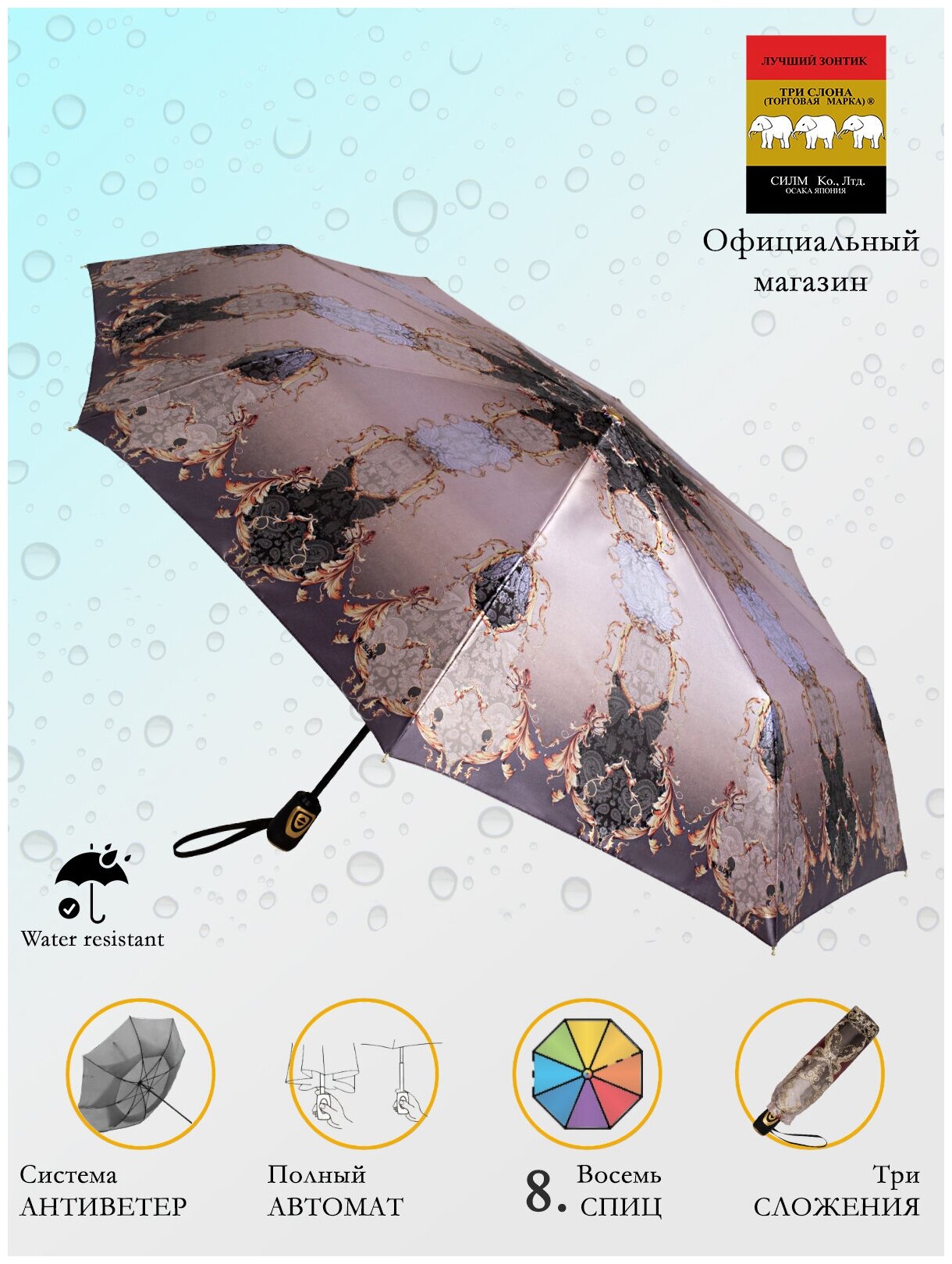 Зонт женский ТРИ слона, 3 сложения автомат, 3828-V-02, серый,голубой интересное: