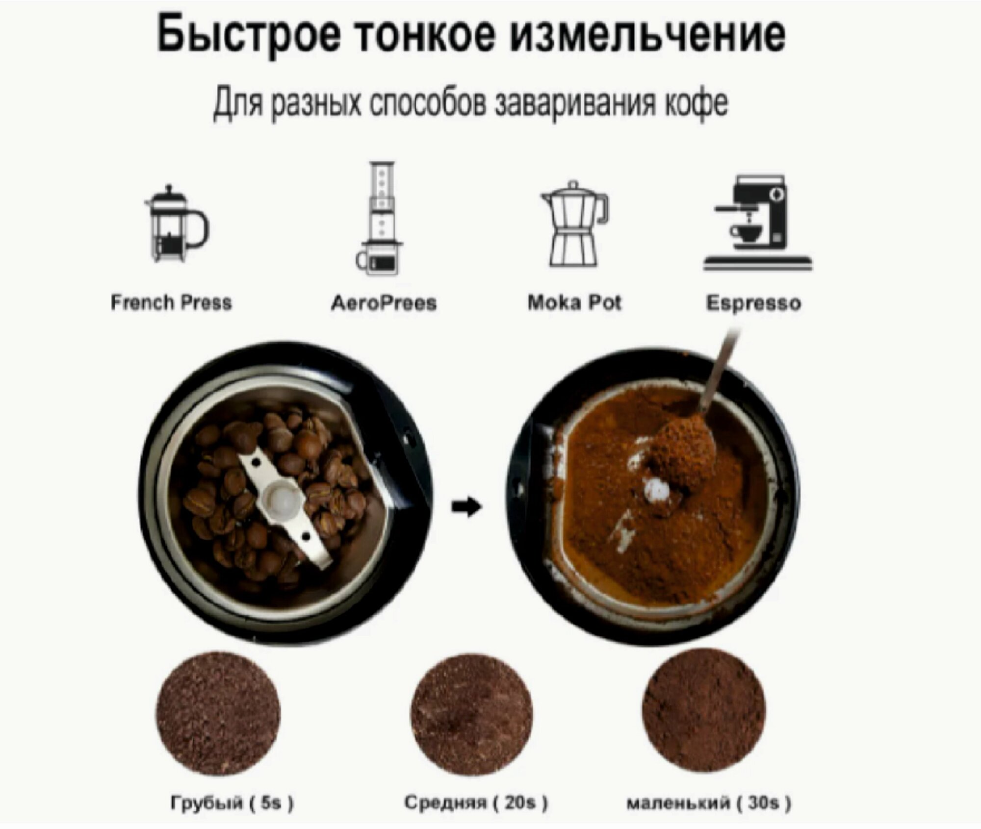 | Дополнительная информация | Эта кофемолка обладает вместимостью в 50 грамм, а ее лезвия изготовлены из нержавеющей стали, что гарантирует долгий срок службы и высокую эффективность измельчения кофейных зерен. Безопасность использования продукта обеспечивается встроенной системой, которая позволяет кофемолке работать только при надежно установленной крышке. Это исключает возможность случайных травм и обеспечивает безопасное и удобное приготовление свежего кофе. |