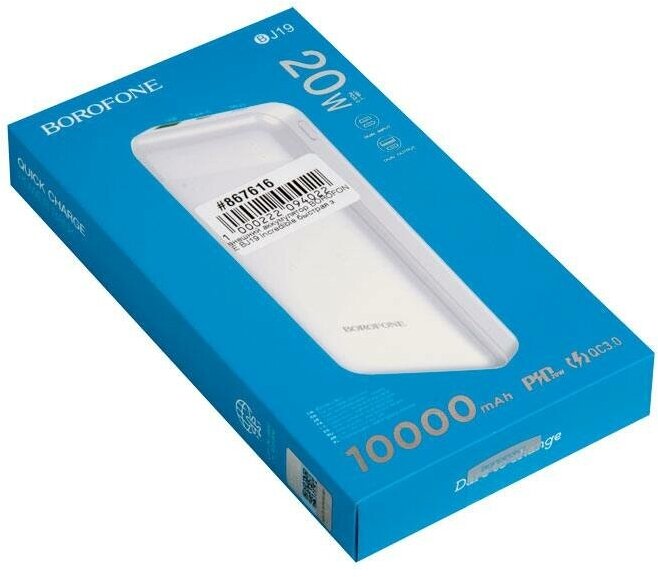 Мобильный аккумулятор BOROFONE BJ19 10000mAh, QC3.0, 1 USB выход, микро USB, PD20W, индикатор, 3.0A, белый (6974443381597)