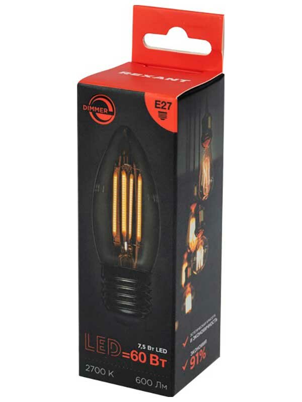 Купить Филаментная лампа REXANT Свеча CN35 7.5 Вт 2700K E27 диммируемая 604-089