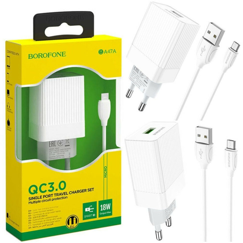 Сетевое зарядное устройство (СЗУ) Borofone BA47A QC 3.0 (USB) + кабель MicroUSB, 3 А, белый