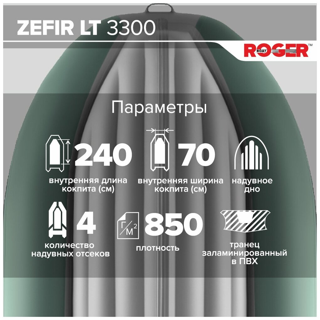 Лодка надувная ПВХ под мотор ROGER Zefir 3300 LT, лодка роджер НДНД малый киль (зеленый-серый)