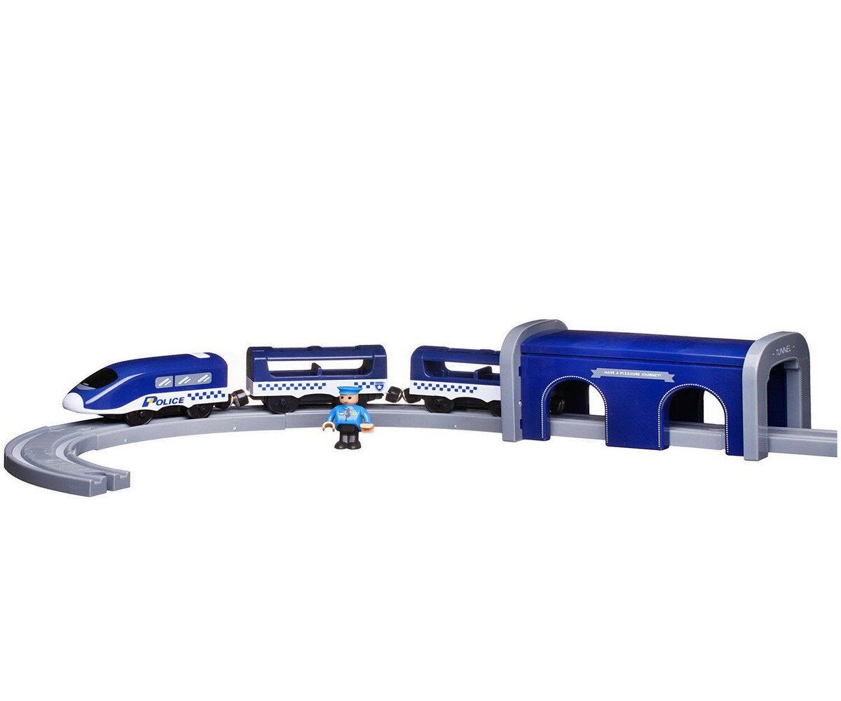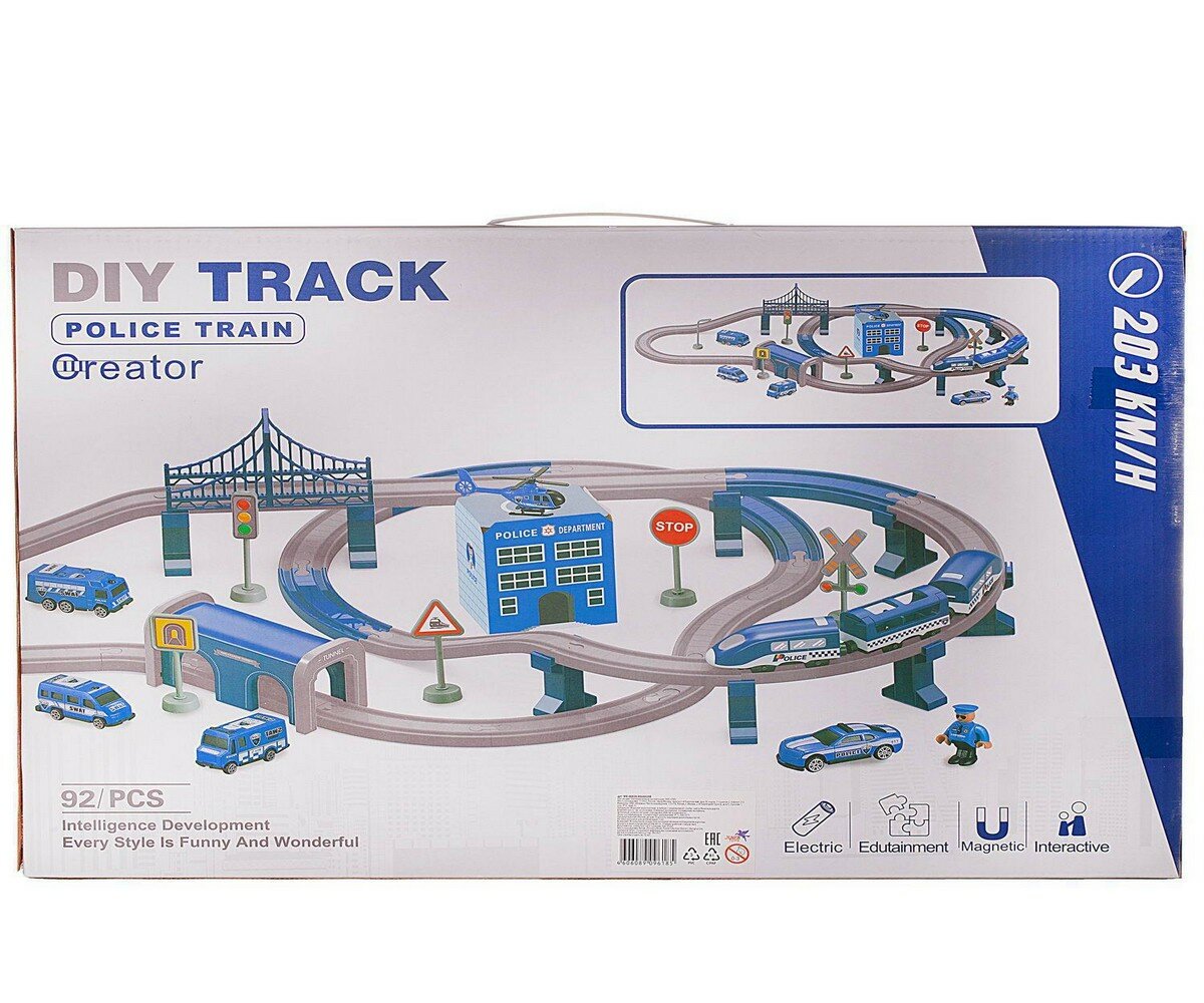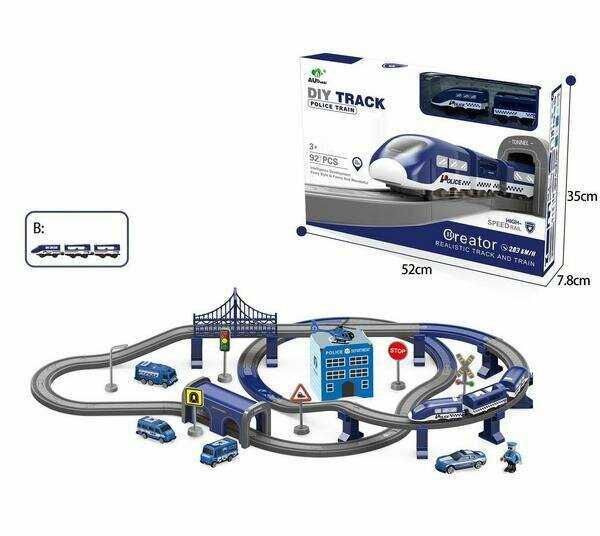 Железная дорога с ландшафтным дизайном Полиция, не менее 92 деталей, со световыми и звуковыми эффектами, в коробке 52,3х8х35см - Junfa Toys [WB-00838]