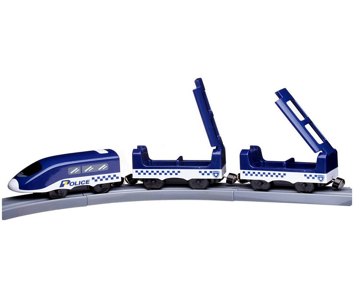Красивый дизайн, классный мост. Машинки и здание полиции в комплекте. Поезд едет очень бодро, сбивает все машинки на своем пути)) |