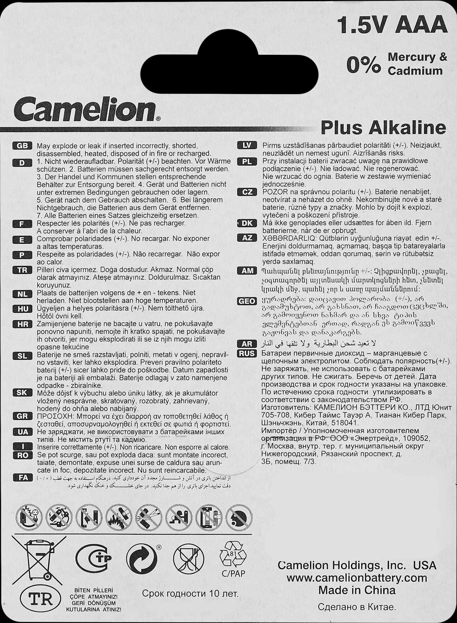 Plus Alkaline AAA, 12 шт. LR03-HP12, CAMELION LR03HP12 (1 шт.)
