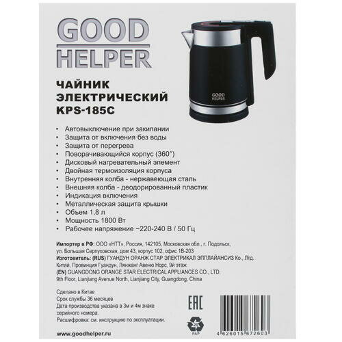 Чайник электрический GOODHELPER KPS-185C черный, 1,8л, 1800Вт