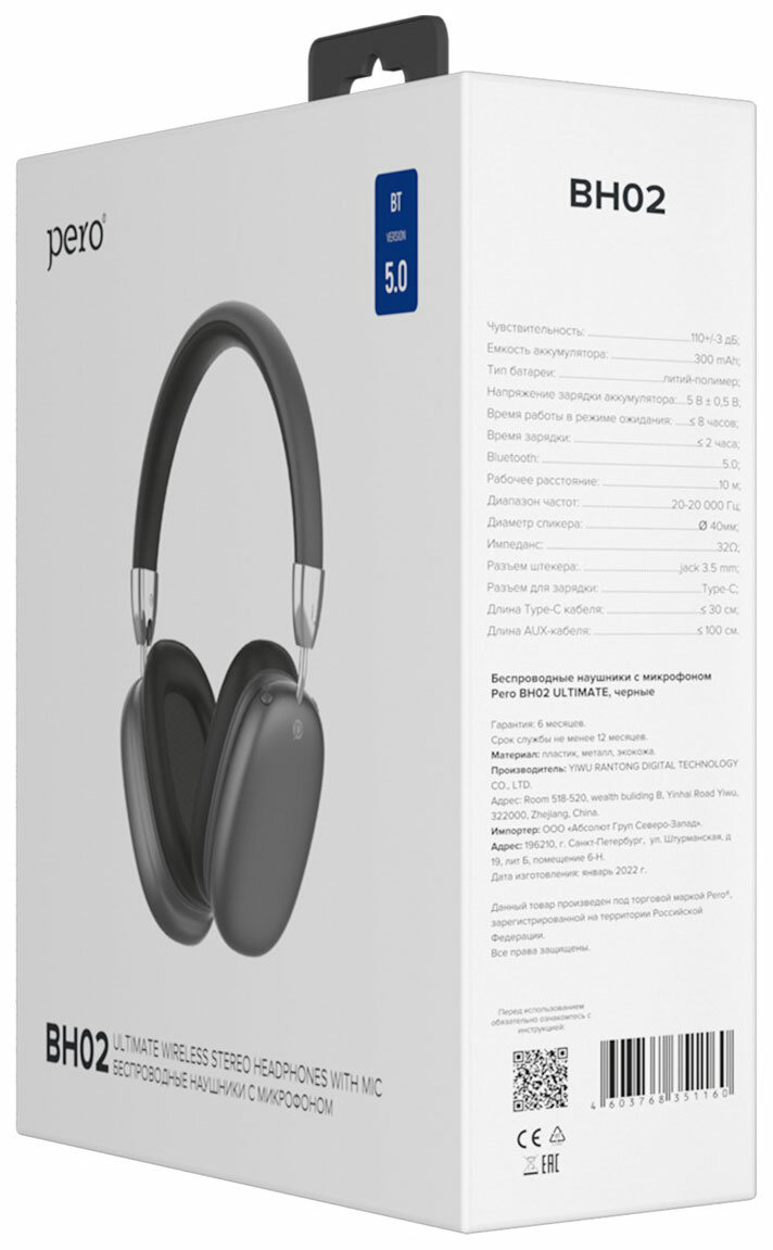 Наушники Pero Bh02, беспроводные, полноразмерные, микрофон, 300 мАч, до 8 часов, черные Pero 9568377 .