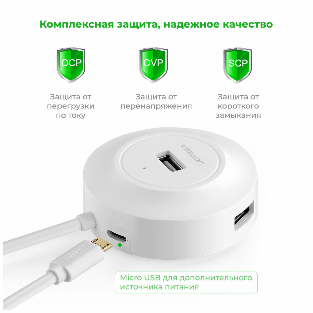 Хаб USB-A 4 в 1 UGREEN CR106 / 4xUSB-A 2.0, Жесткие диски до 10ТБ / Доп. питание Micro USB / Кабель 1м / цвет белый (20270)