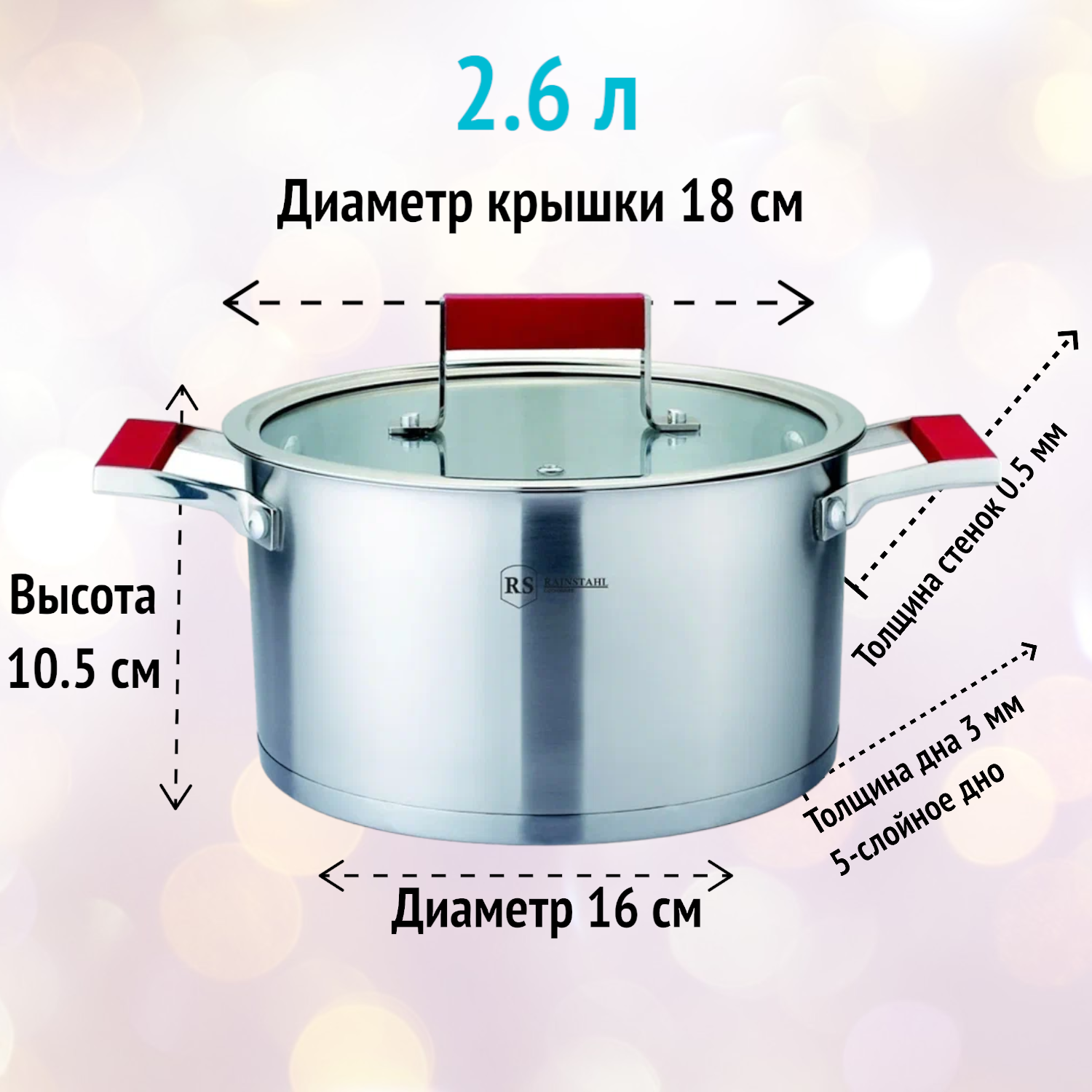 Кастрюля Нержавеющая 2,6л d180 h10,5 Ст/Кр Мет/Сил/Руч Red Индукционное Дно П/Уп Rainstahl RS/CS2912-18