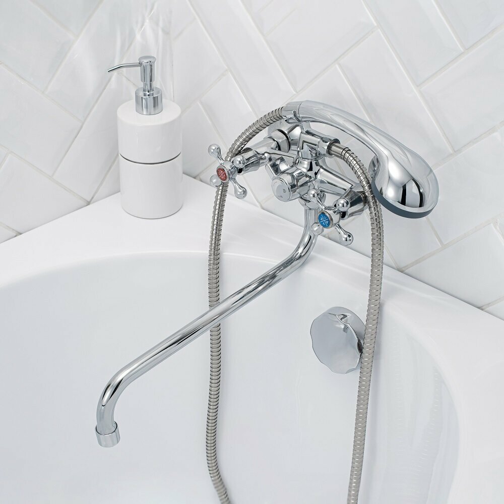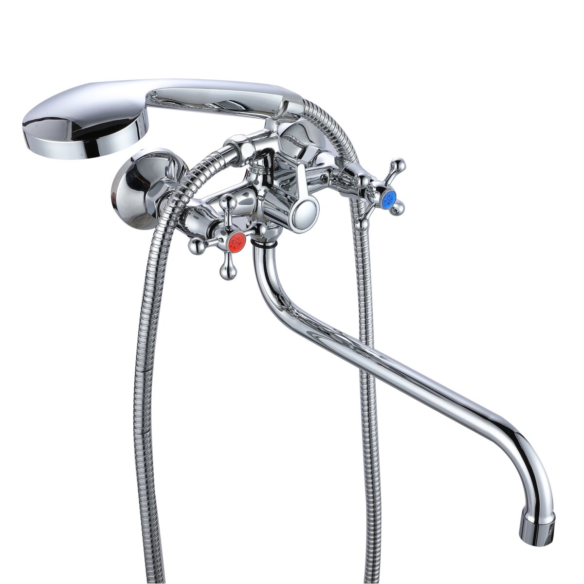 Смеситель для ванны, РМС SL71-140, длинный поворотный излив, с душевой лейкой и шлангом, двухвентильный