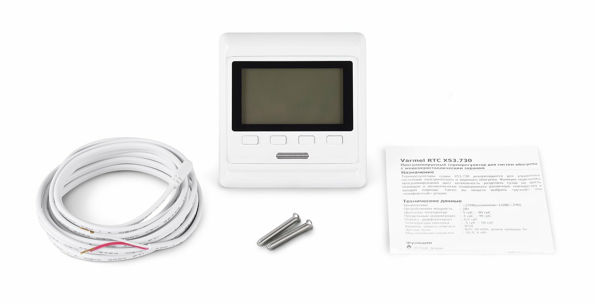 | Дополнительная информация | Терморегулятор Varmel RTC X53.730, выносной датчик температуры теплого пола, два винта для крепления, инструкция по эксплуатации, коробка. терморегулятор, терморегулятор для теплого пола, термостат, термостат для теплого пола, регулятор, регулятор для теплого пола, электронный терморегулятор, электронный терморегулятор для теплого пола, электронный термостат, электронный термостат для теплого пола, электронный регулятор, электронный регулятор для теплого пола, электронный программируемый терморегулятор, электронный программируемый терморегулятор для теплого пола, электронный программируемый термостат, электронный программируемый термостат для теплого пола, электронный программируемый регулятор, электронный программируемый регулятор для теплого пола, wi-fi терморегулятор, wi-fi терморегулятор для теплого пола, wi-fi термостат, wi-fi термостат для теплого пола, wi-fi регулятор, wi-fi регулятор для теплого пола, управление с телефона, управление со смартфона. |