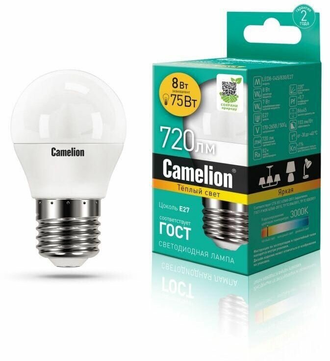 Лампа светодиодная LED8-G45/830/E27 8Вт шар 3000К тепл. бел. E27 720лм 170-265В Camelion 12392 интересное: