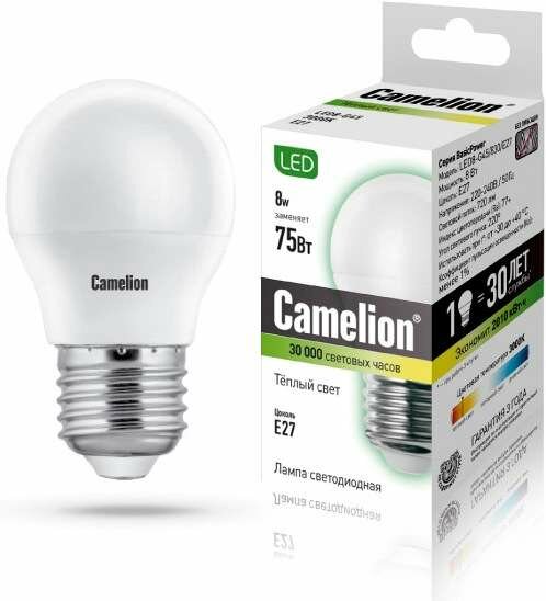 Купить Лампа светодиодная LED8-G45/830/E27 8Вт шар 3000К тепл. бел. E27 720лм 170-265В Camelion 12392