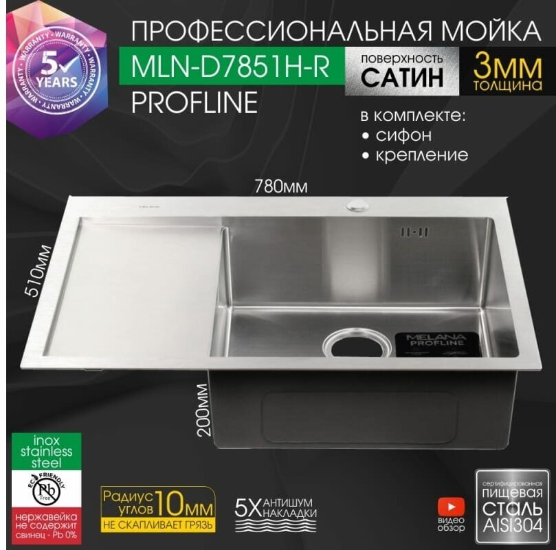 Мойка D7851H-R MELANA ProfLine 3,0/200 сатин врезная прямоугольная правая D7851H-R интересное: