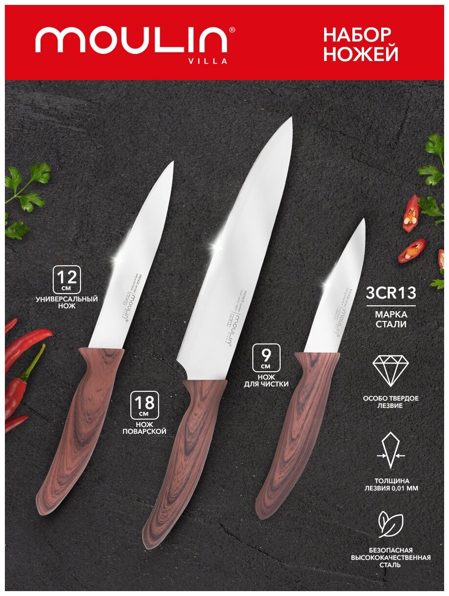 | Дополнительная информация | В наборе 3 ножа: поварской (18 см), универсальный (12 см), для чистки (9 см) |