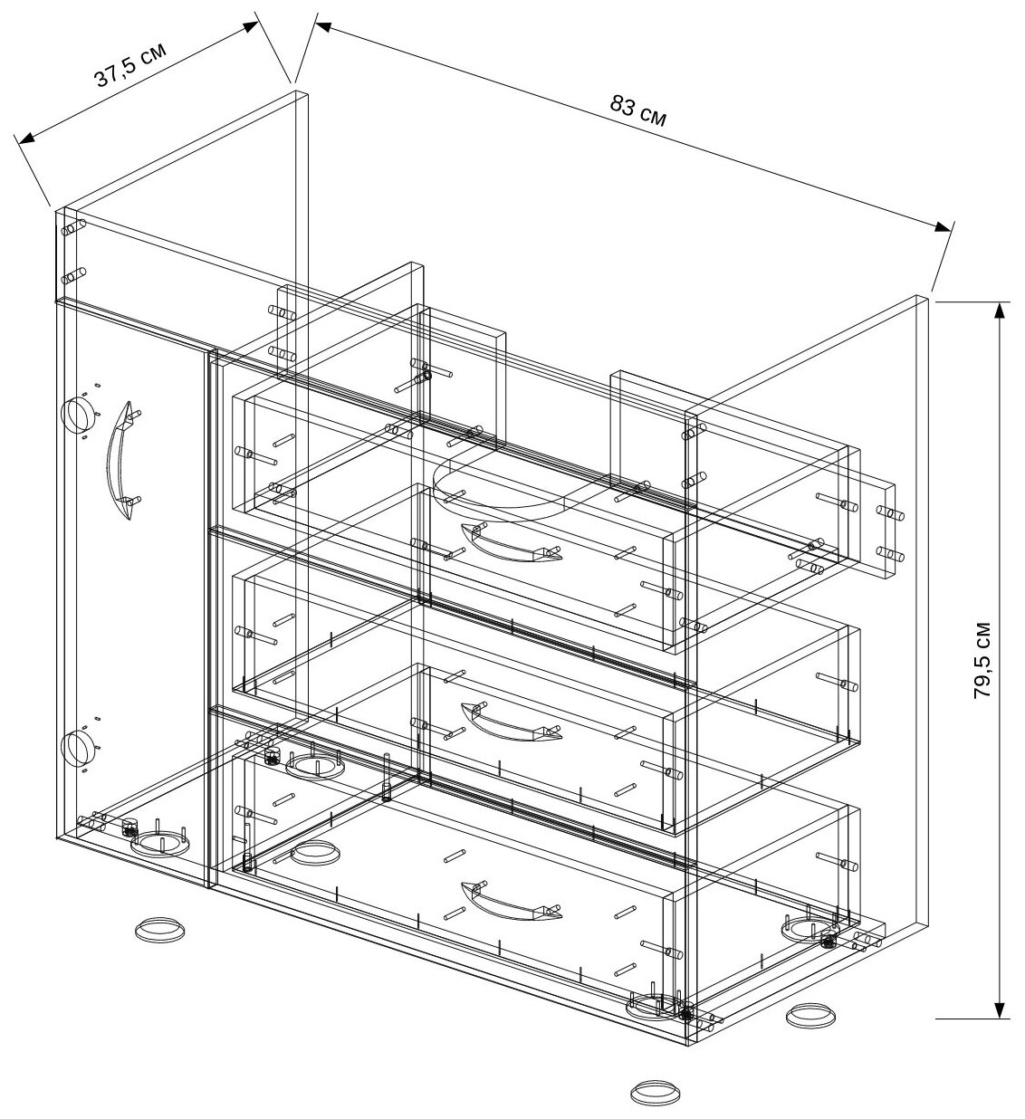 | Комплектация | В комплекте 3 ящика, 1 дверца, 4 ручки, 4 ножки, раковина Kirovit Элвис 850. |