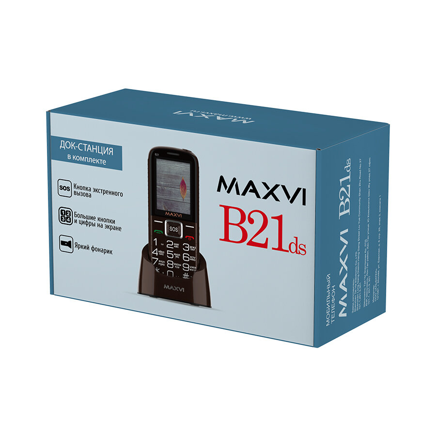 | Комплектация | Простой в использовании функциональный телефон с ДОК-станцией и функцией SOS, которая позволит мгновенно отправить сигнал тревоги в экстренных случаях. Maxvi B21ds оснащён ярким фонариком, ёмкой батарей 1600 мАч и громким динамиком. |