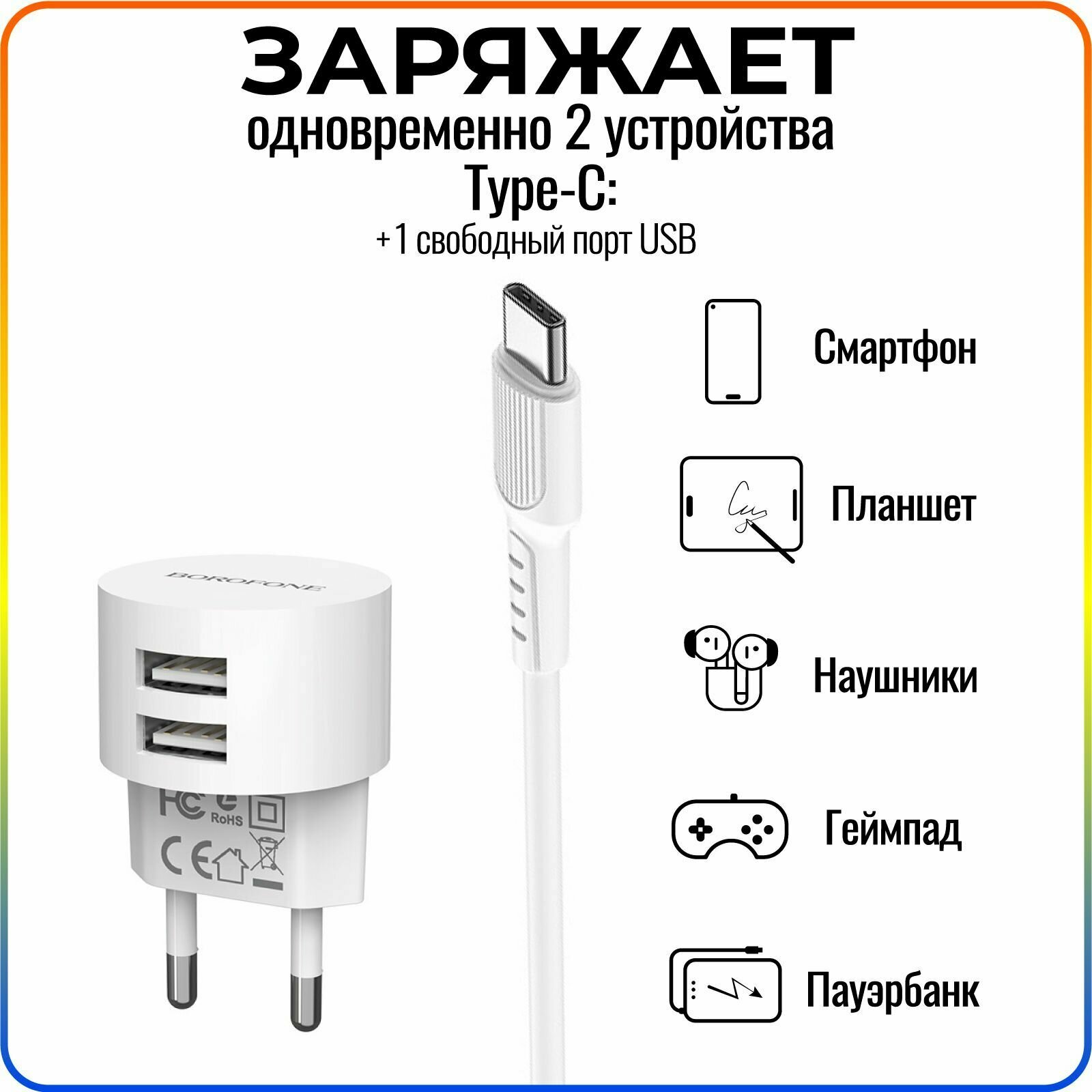 Сетевое зарядное устройство (СЗУ) Borofone BA23A (2 USB) + кабель Type-C, 2.4 А, белый