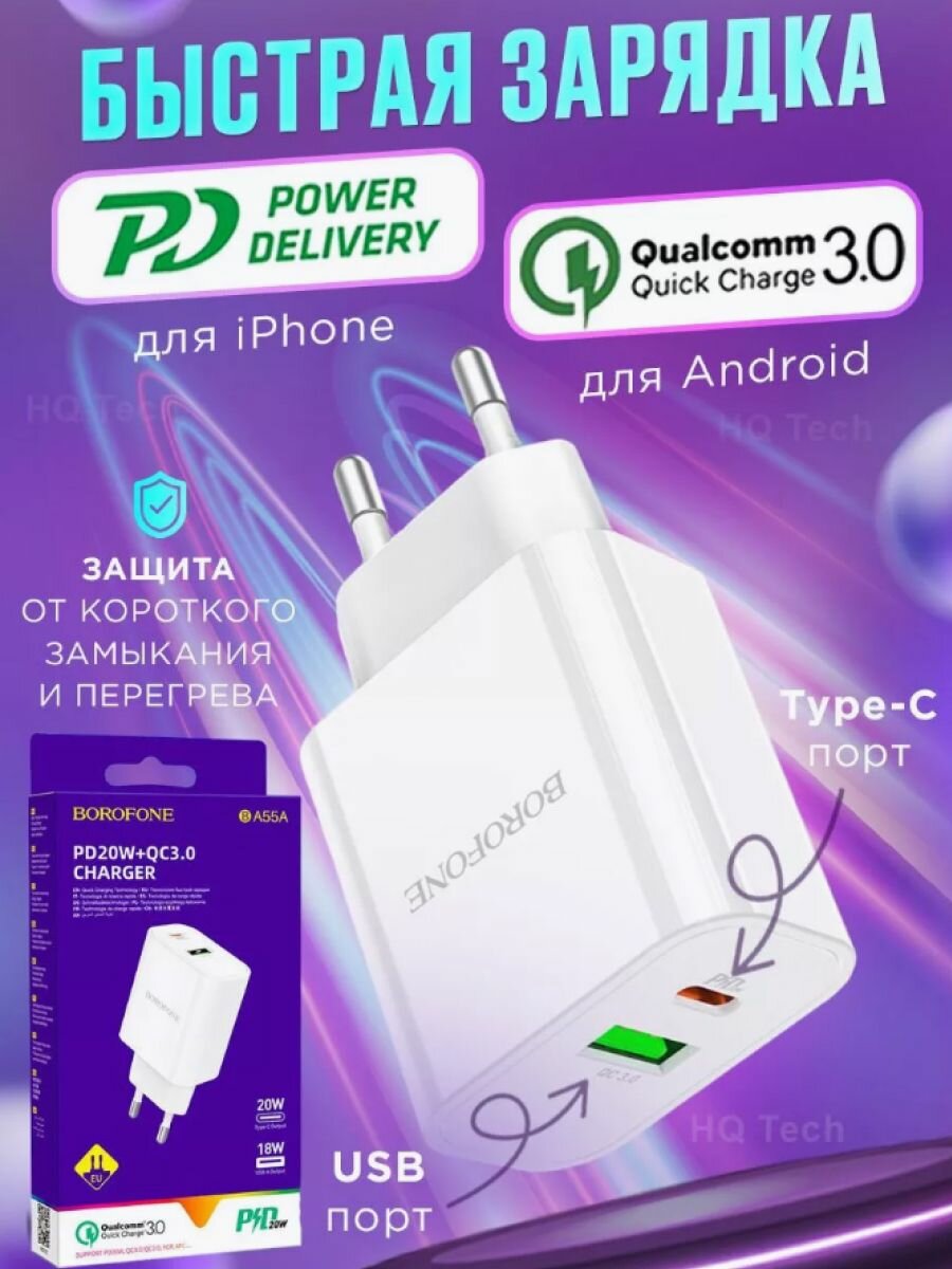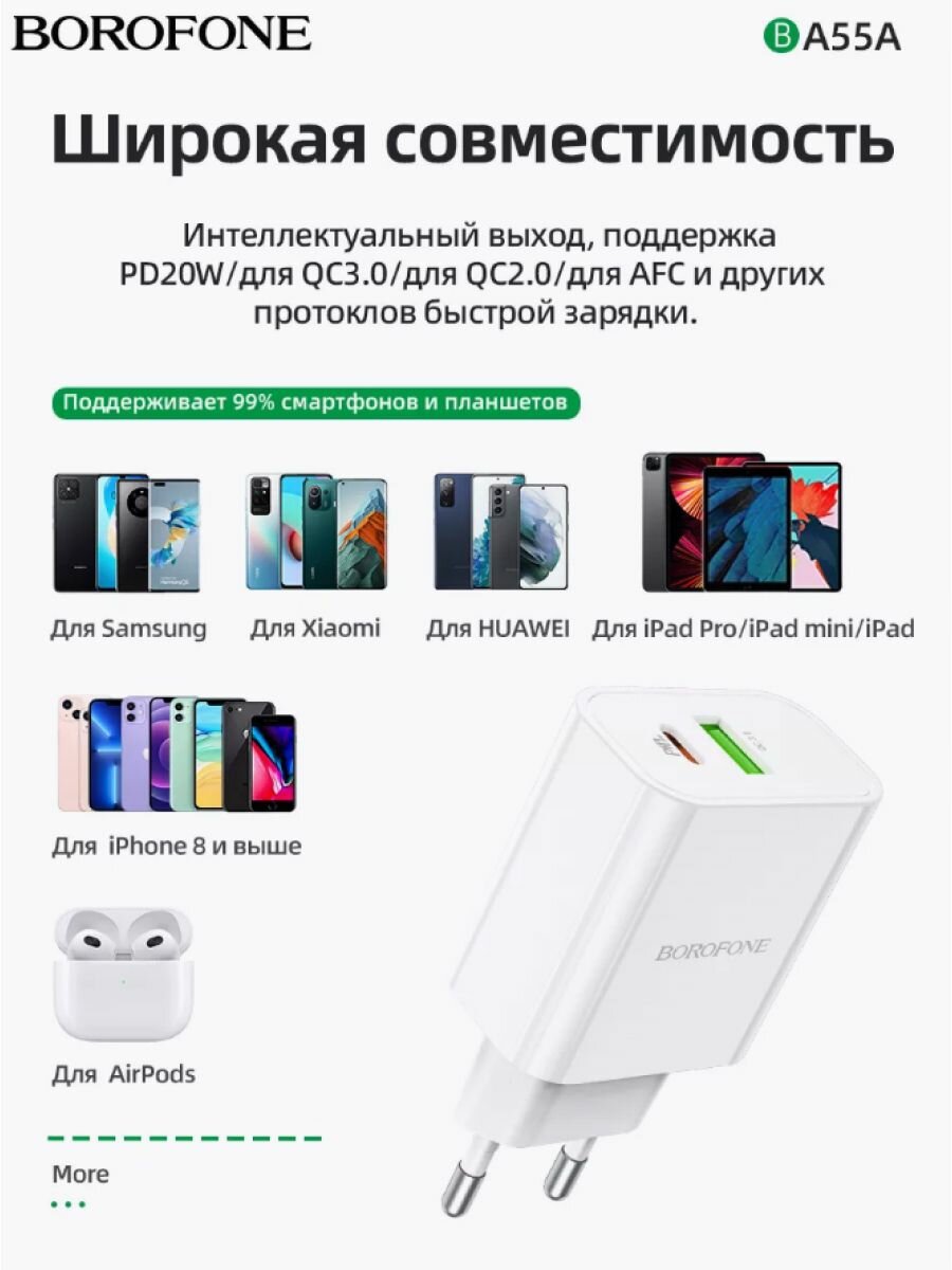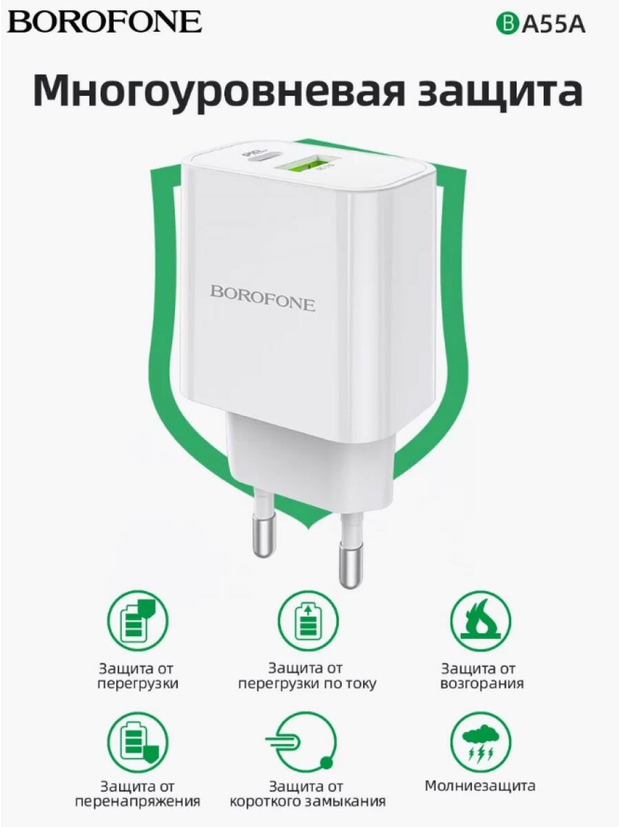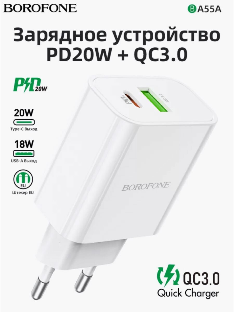 Зарядка для телефона BOROFONE BA55A Crown Speed 1xUSB QC3.0, 3A, 1хUSB-C PD, 20W (белый)