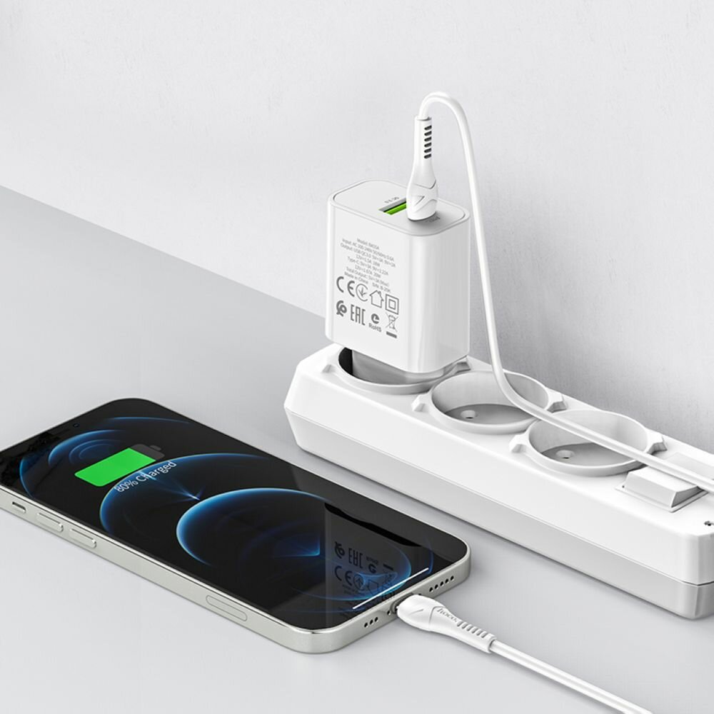Блок питания сетевой 1 USB, Type-C Borofone BA55A, Crown, 20Вт, QC3.0, PD, цвет: белый