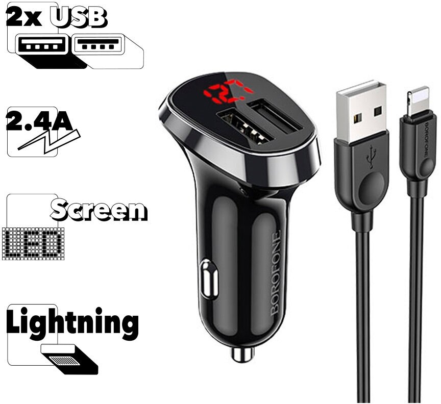 Автомобильное зарядное устройство BOROFONE BZ15 Auspicious 2xUSB, 2.4A, LED дисплей + кабель Lightning 8-pin, черный