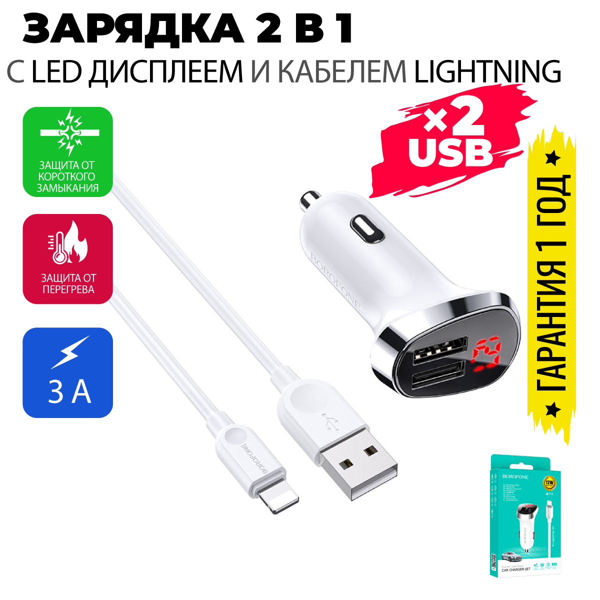 Зарядка автомобильная для телефона, смартфона в прикуриватель, на 2 usb(юсб) порта, с индикатором и проводом на айфон Lightning / BOROFONE BZ15