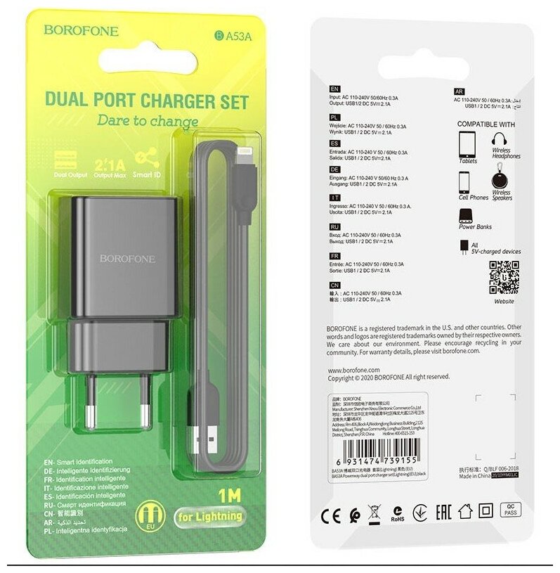 Сетевое зарядное устройство (СЗУ) Borofone BA53A (USB) + кабель Lightning, 2.1 А, черный