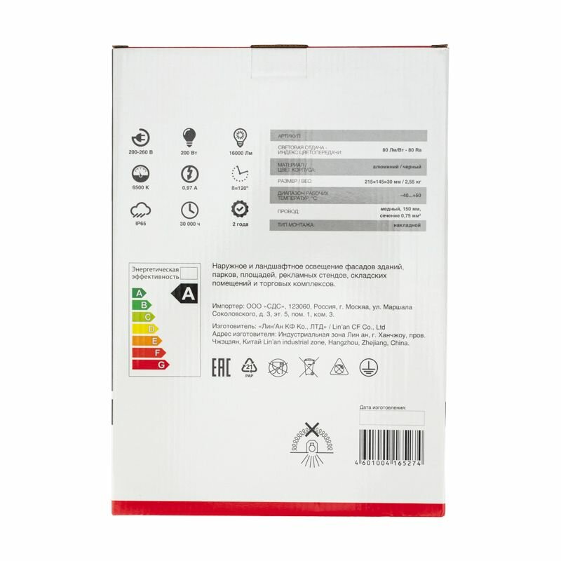 Прожектор светодиодный Rexant 200 Вт, 200-260В, Ip65, 16000 Лм, 6500 K, холодный свет .