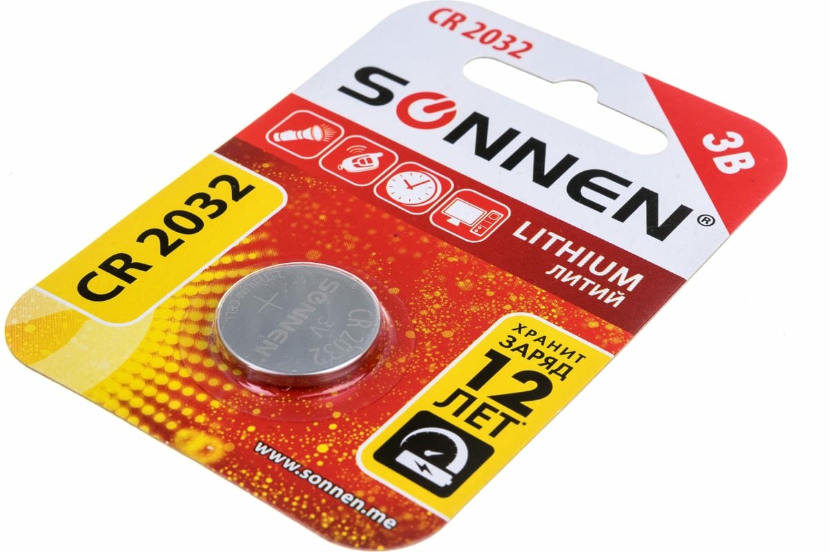 Батарейка SONNEN, CR2032 (таблетка), d=20 мм, h=3,2 мм, литиевая, 1 шт., в блистере, 3 В, 451974