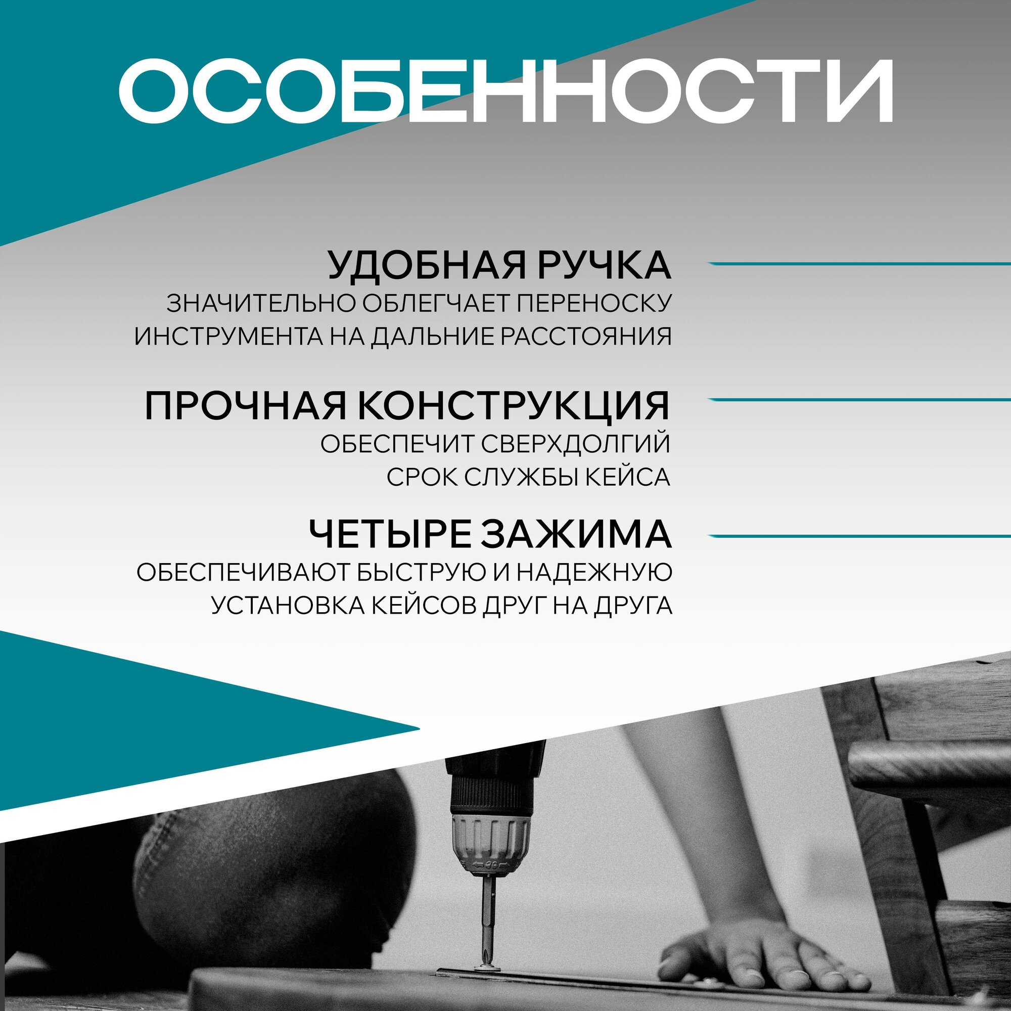 Хороший кейс за вменяемые деньги. Пластик достаточно прочный, правда на морозе я бы с ними был очень аккуратным, могут треснуть. Стыкуется с ящиками от Интерскола, вот они сделаны из намного более мягкого пластика