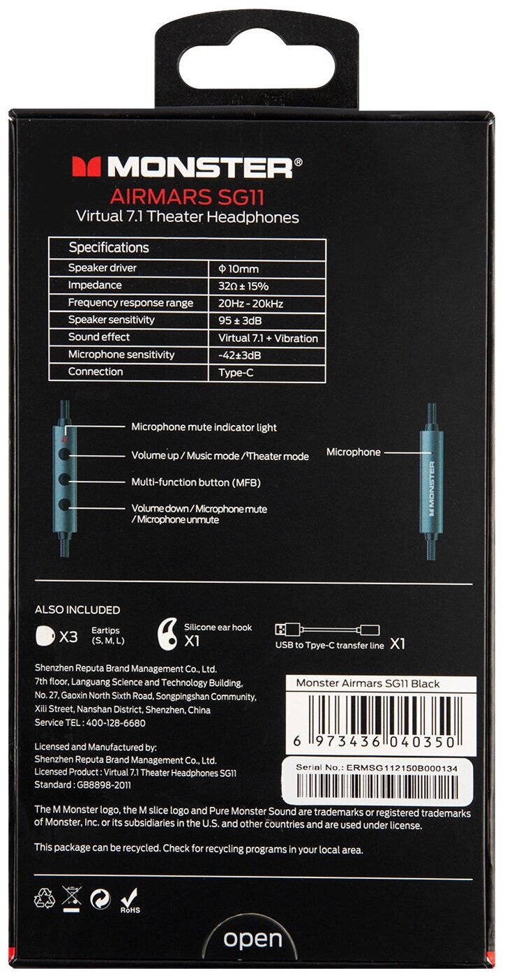 Купить Гарнитура Redline вкладыши Monster Airmars SG-11 1.2м черный проводные в ушной раковине (УТ000028710)