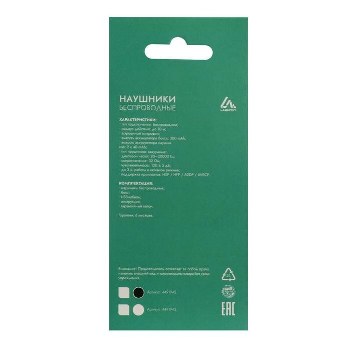 Наушники беспроводные LuazON VBT 1.20, вакуумные, Bluetooth 5.0, 300 мАч бокс, белые 4491943