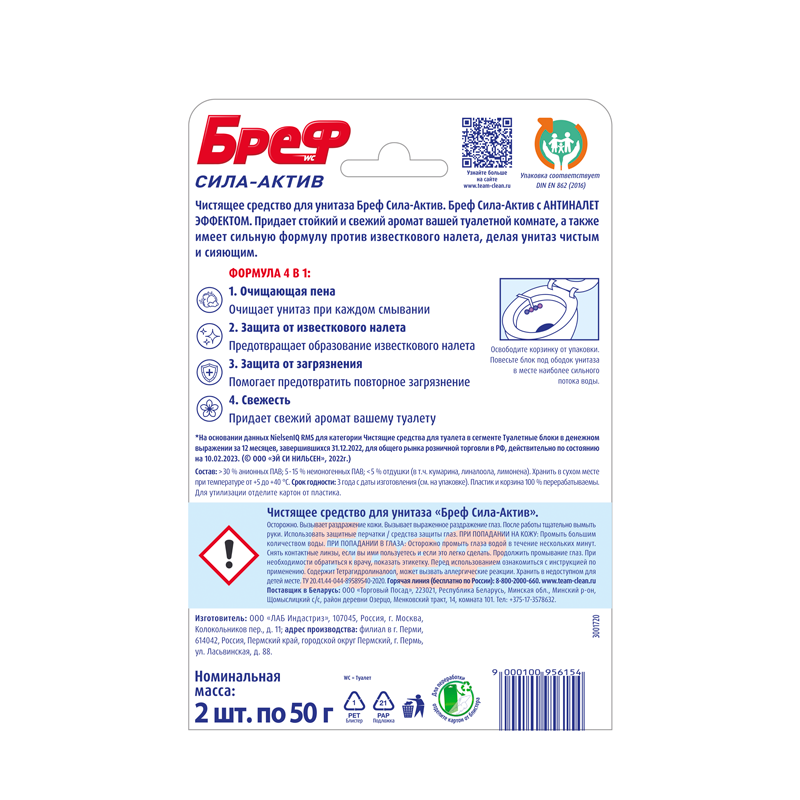 Гигиенический блок для унитаза Bref "Сила-Актив. Лимонная свежесть", 2x50г, блистер (9000100656832)